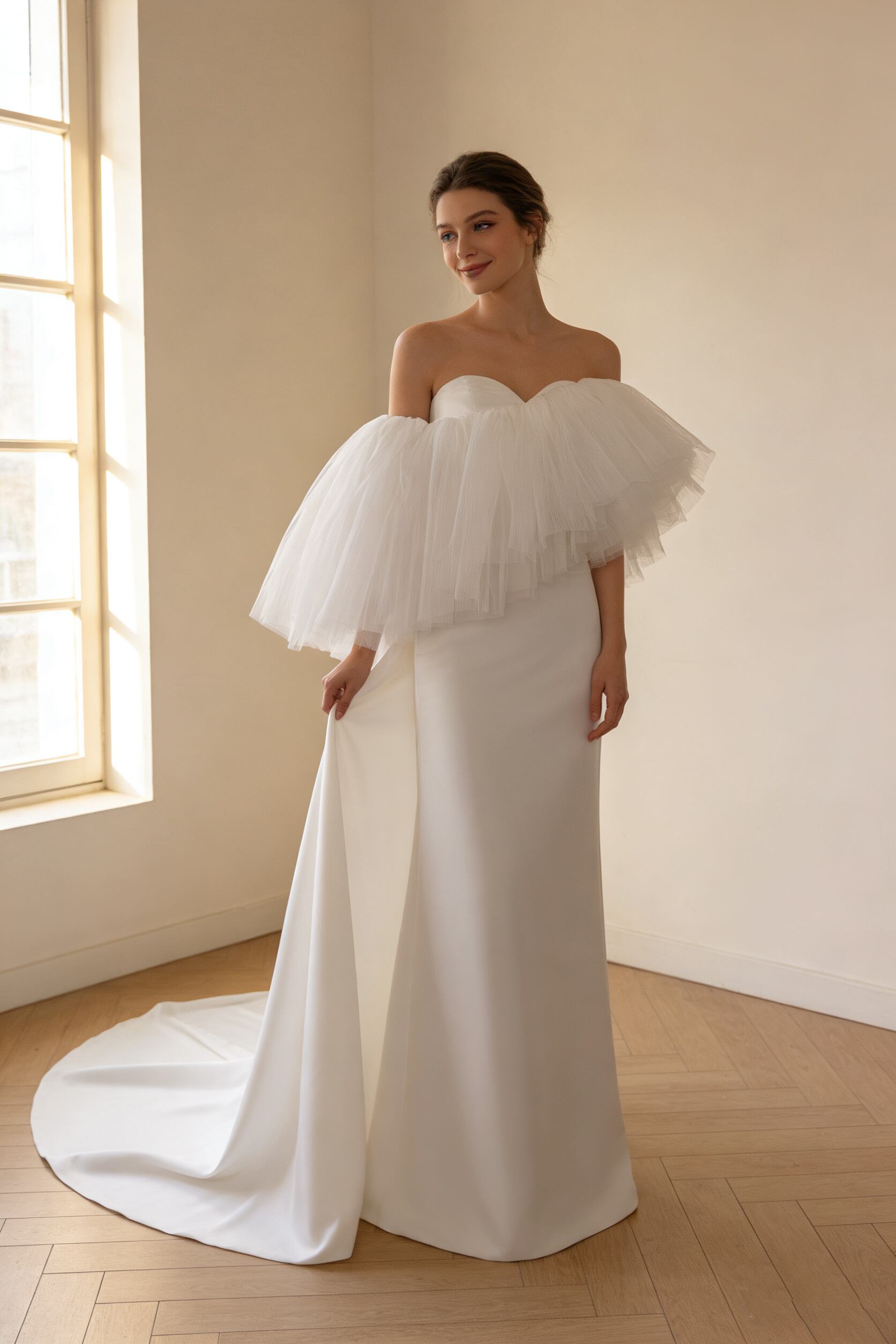 ウェディングドレス ビスチェドレス マーメイドライン オフショルダー 前撮り オフホワイト クレープ生地 ソフトチュール