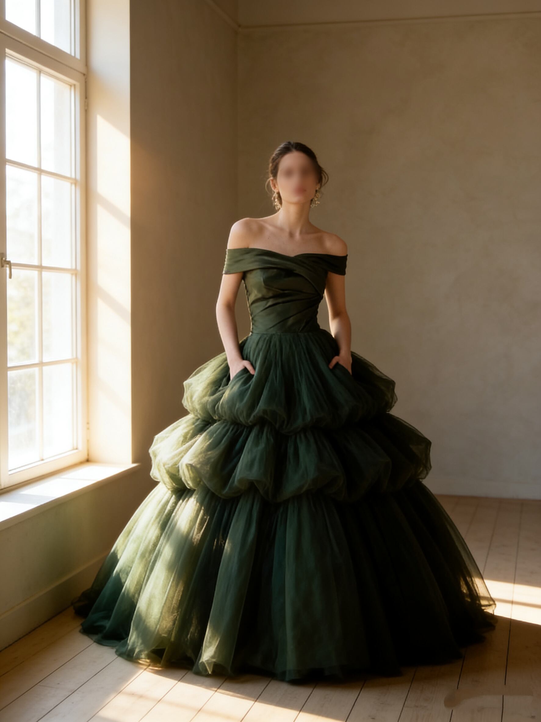 カラードレス オフショルダー ハンドドレープ ティアードのドレス 結婚式 エレガント ふわふわドレス グリーン