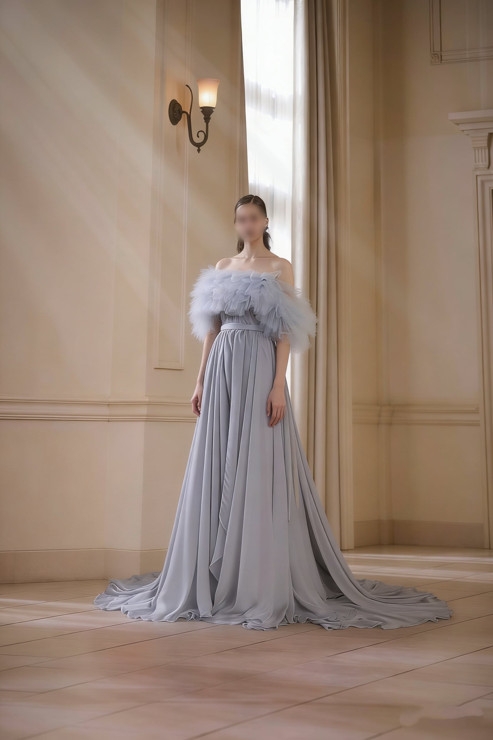 カラードレス グレー オフショルダー ソフトチュール Aライン ブライダル 前撮り