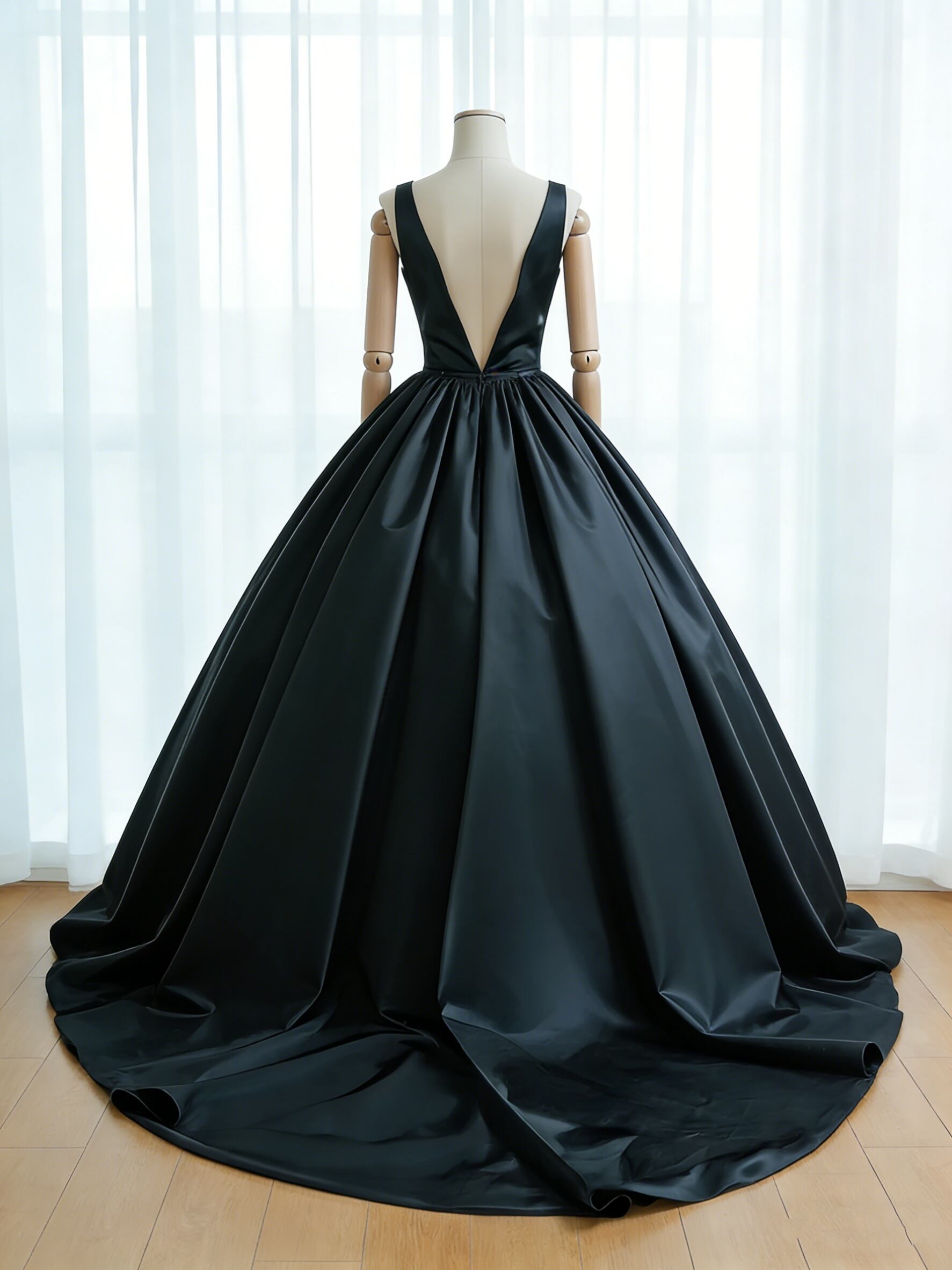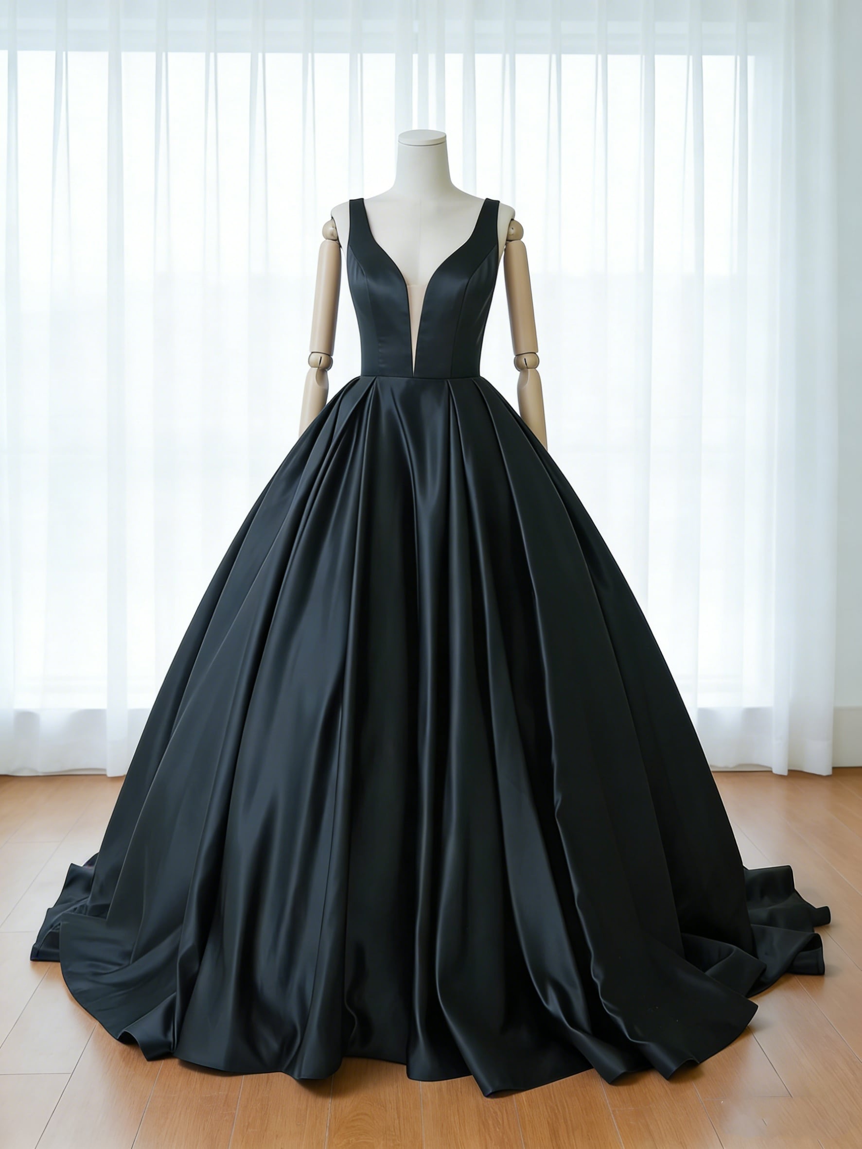 カラードレス ブラック Vネックドレス 光沢サテン ノースリーブ 前撮り エレガント