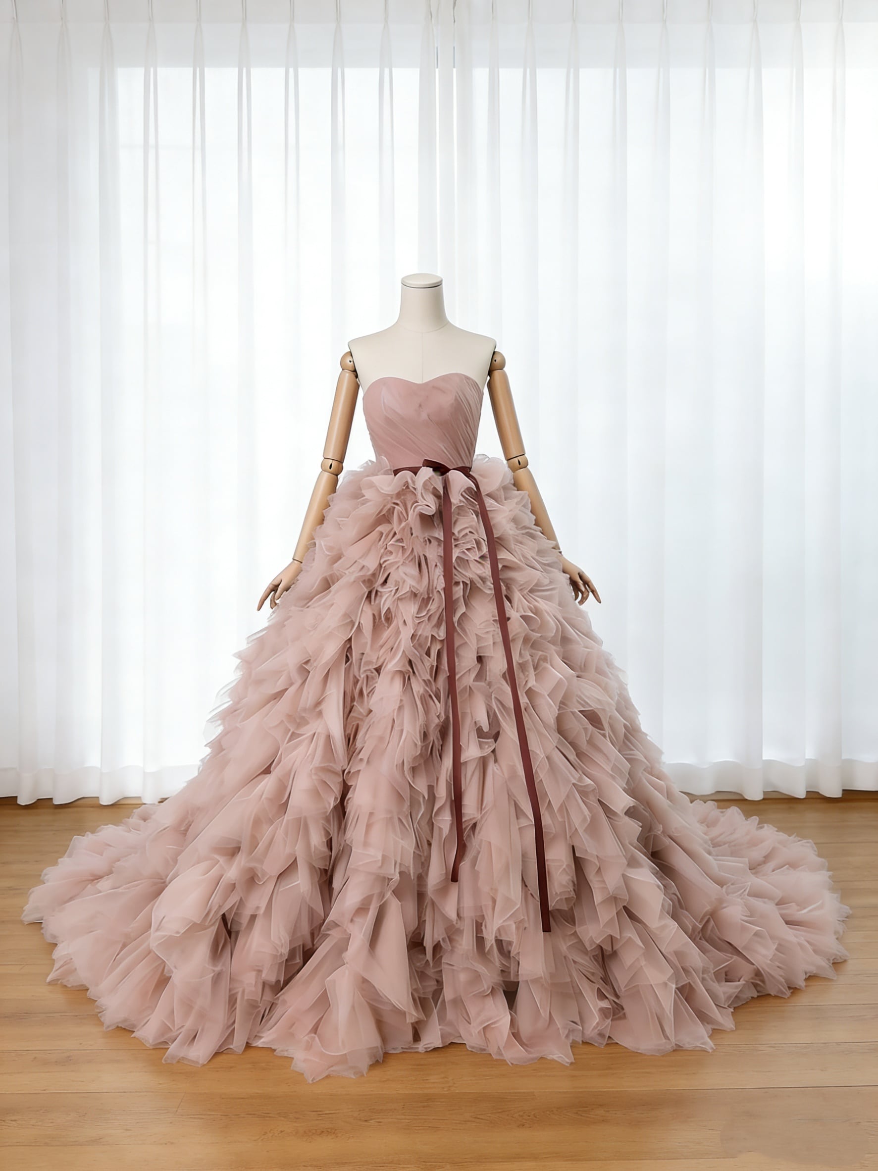 カラードレス ベアトップ ピンク もこもこドレス プリンセスライン サッシュベルト 花嫁/ウェディングドレス