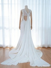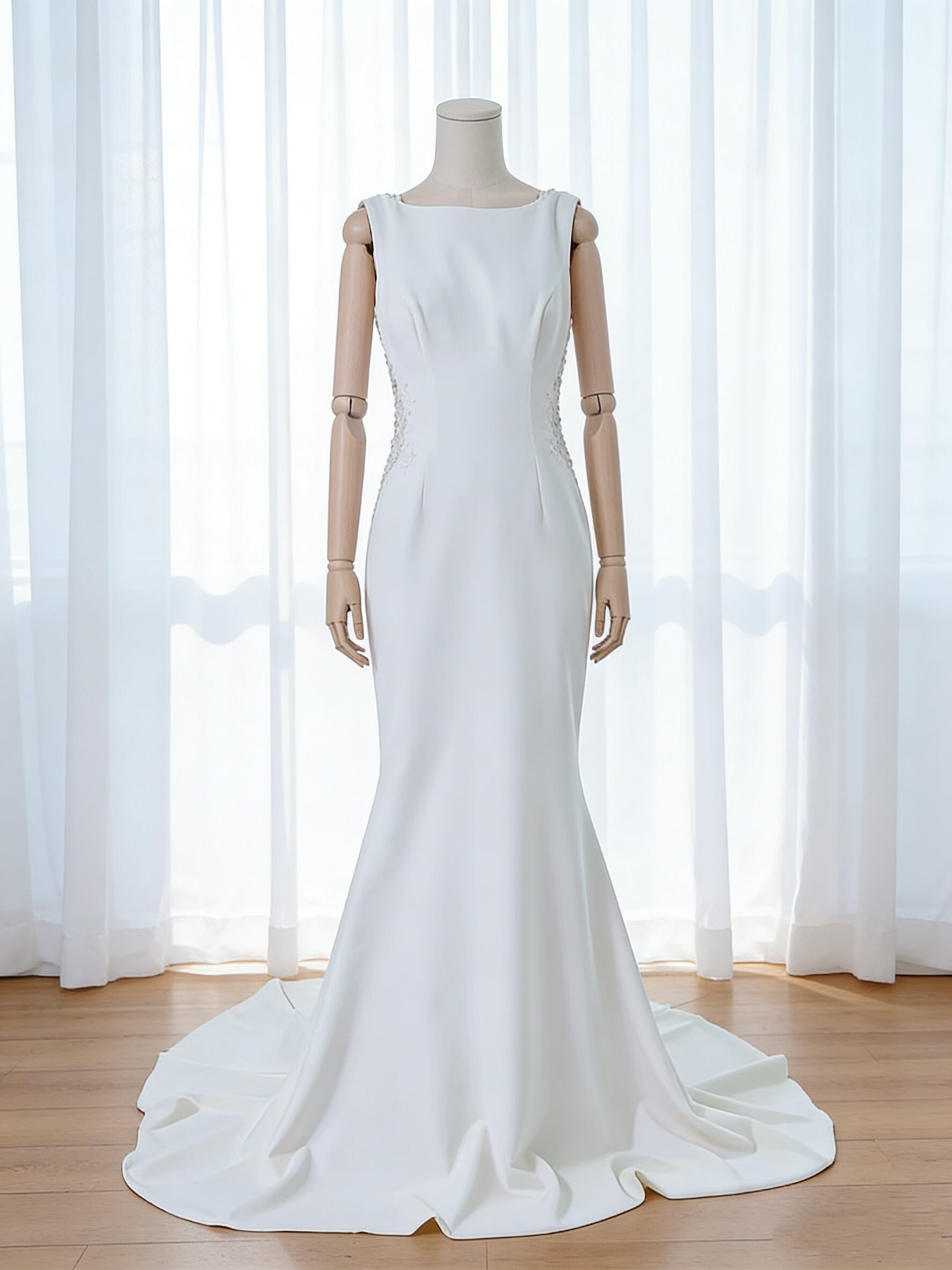 ウェディングドレス ノースリーブ 細見えシルエット リボン マーメイドライン ラウンドネック バックレス クレープ生地