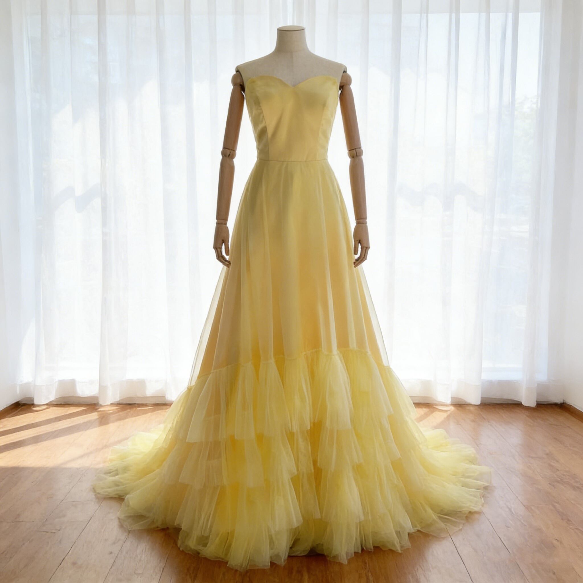 カラードレス ベアトップ イエロー リボントレーン チュールスカート プリンセスライン 結婚式/披露宴