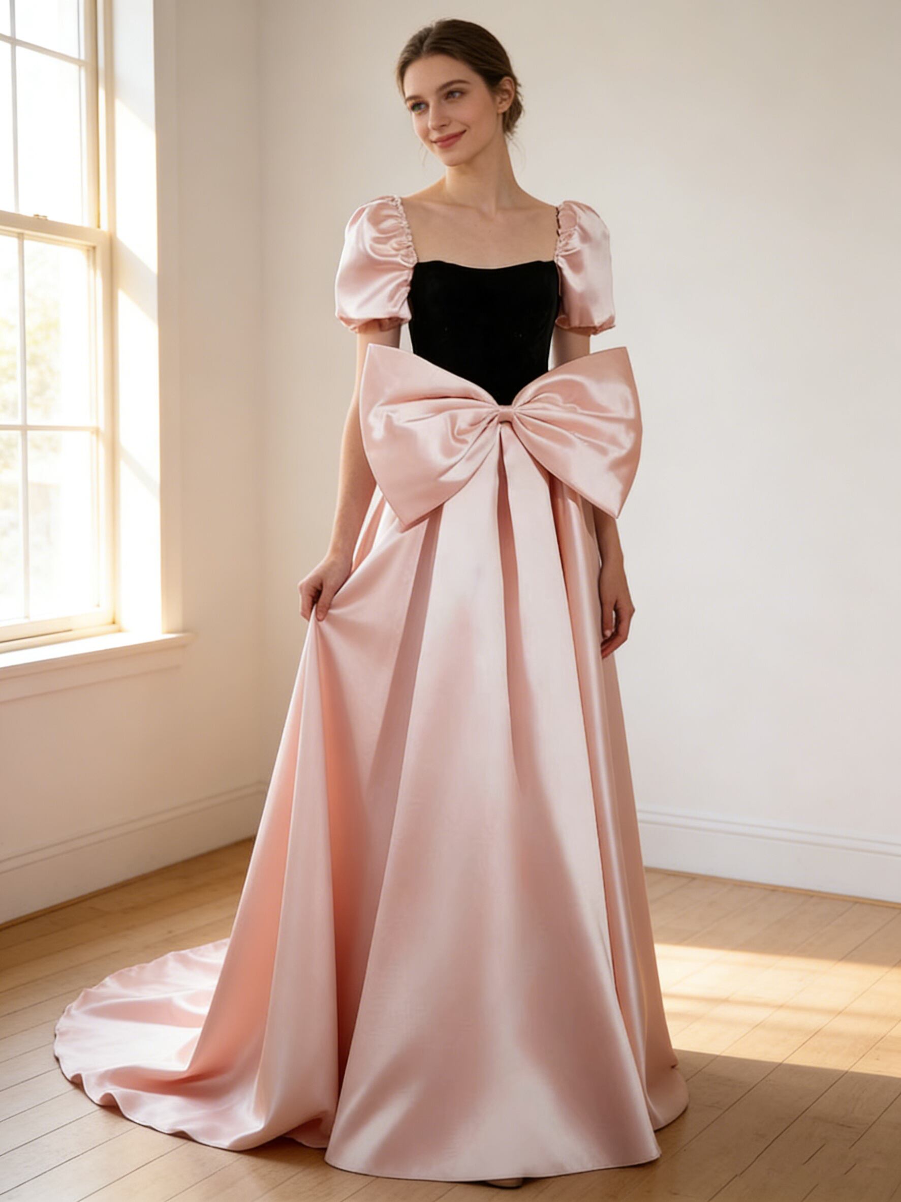 パーティードレス パフスリーブ ピンク ピアノ演奏会/音楽会 リボン 光沢サテン パーティーワンピース