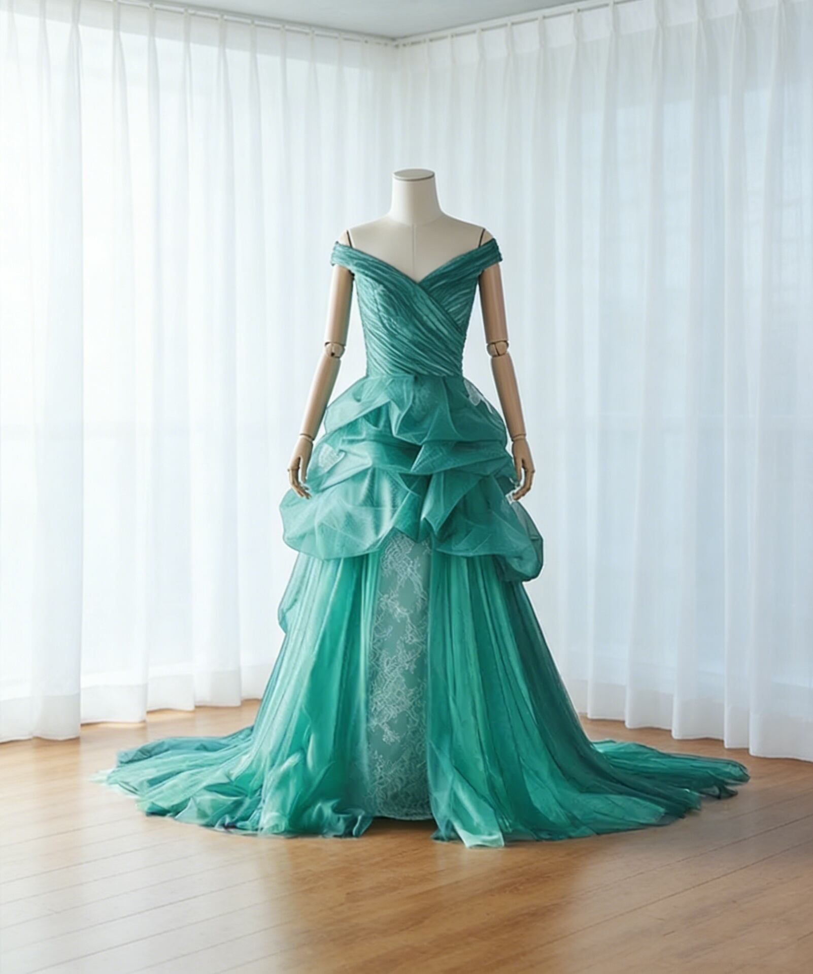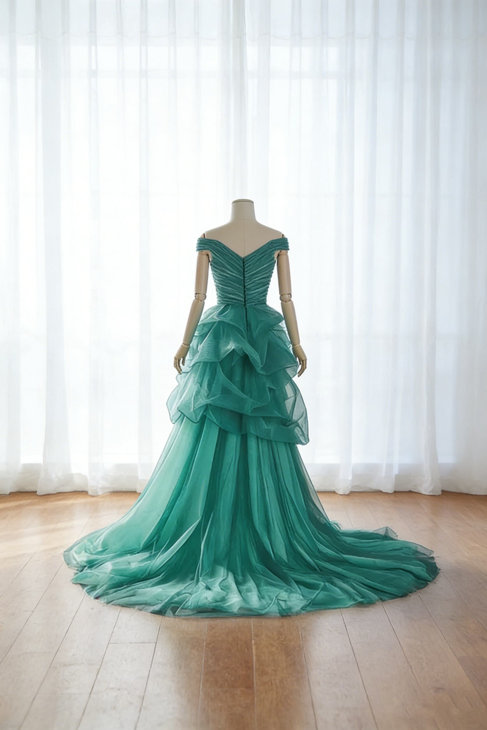 カラードレス カラードレス カラードレス アシンメトリードレス 流れる透け花レース オフショルダー ハンドドレープ