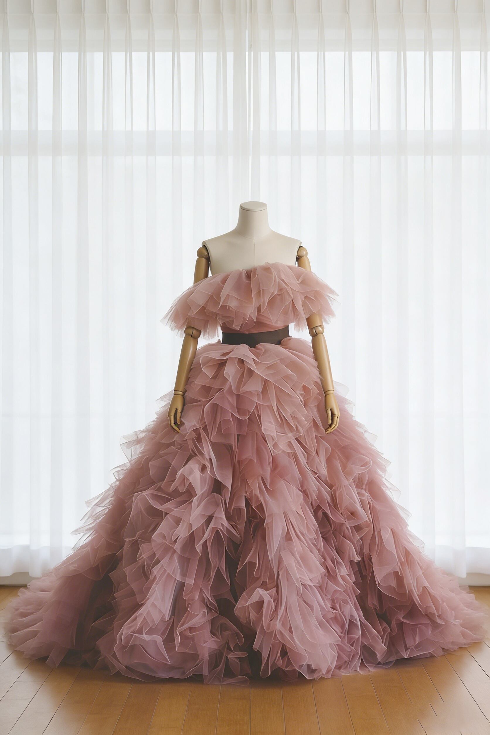 カラードレス ピンク 3ways 取り外しオフショルダー もこもこドレス 編み上げ 華やか 結婚式 花嫁