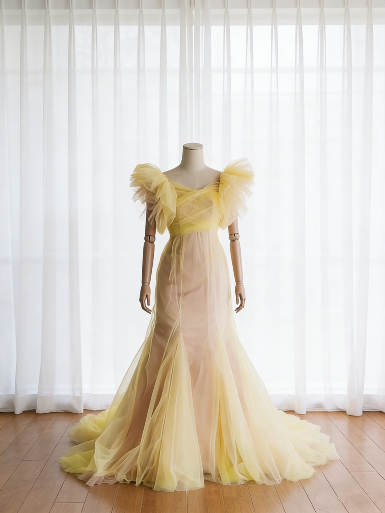 カラードレス マーメイドライン イエロー 結婚式 前撮り フリル袖 ブライダル チュールドレス