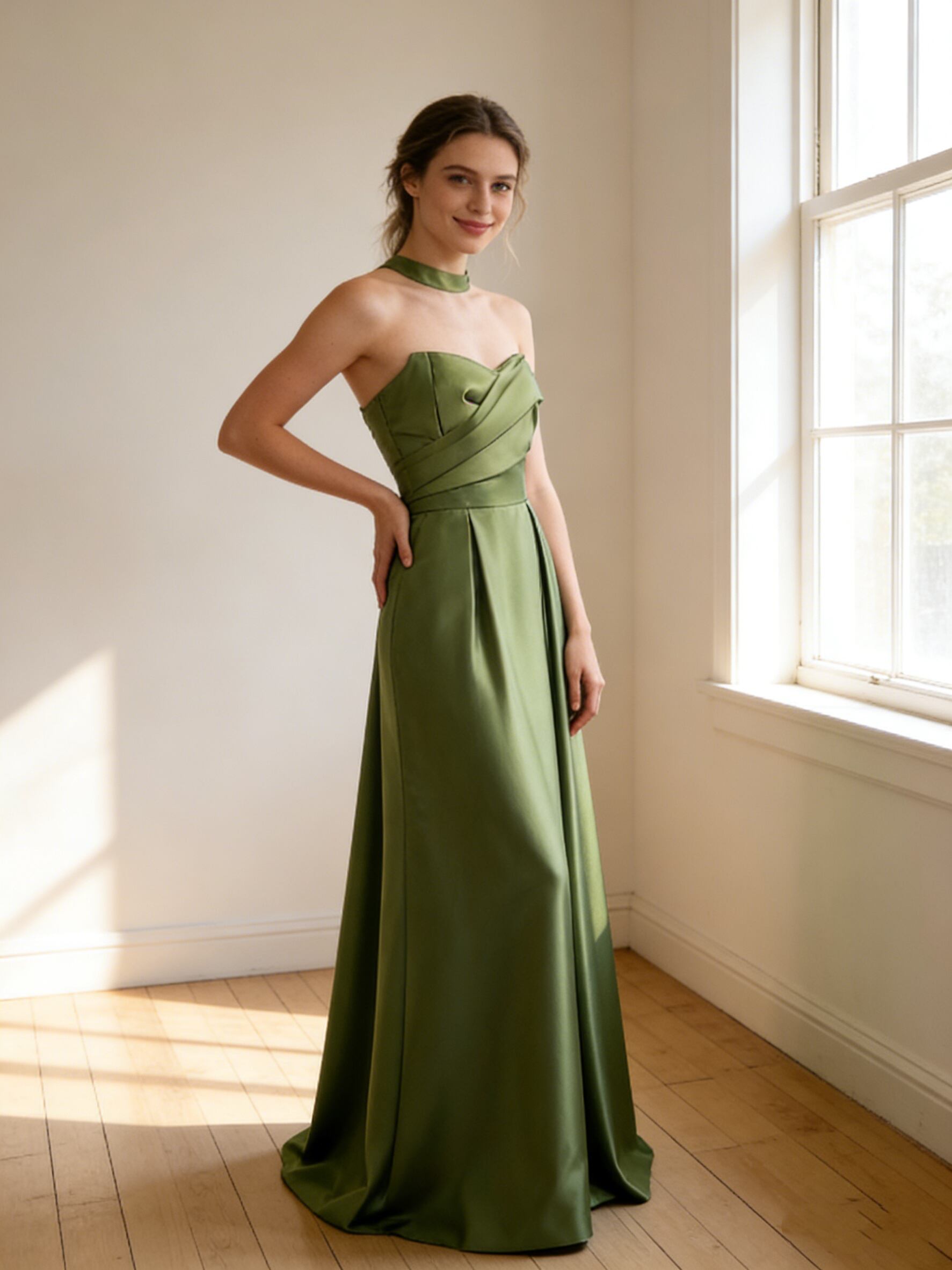 パーティードレス グリーン 光沢サテン ロング ハンドドレープ スレンダーライン 音楽会/発表会など