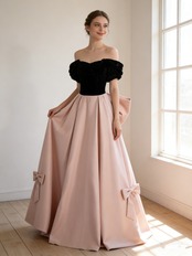 パーティードレス オフショルダー パフスリーブドレス ピンク ブラック ブラック ふっくら柔らかなバックリボン 成人式