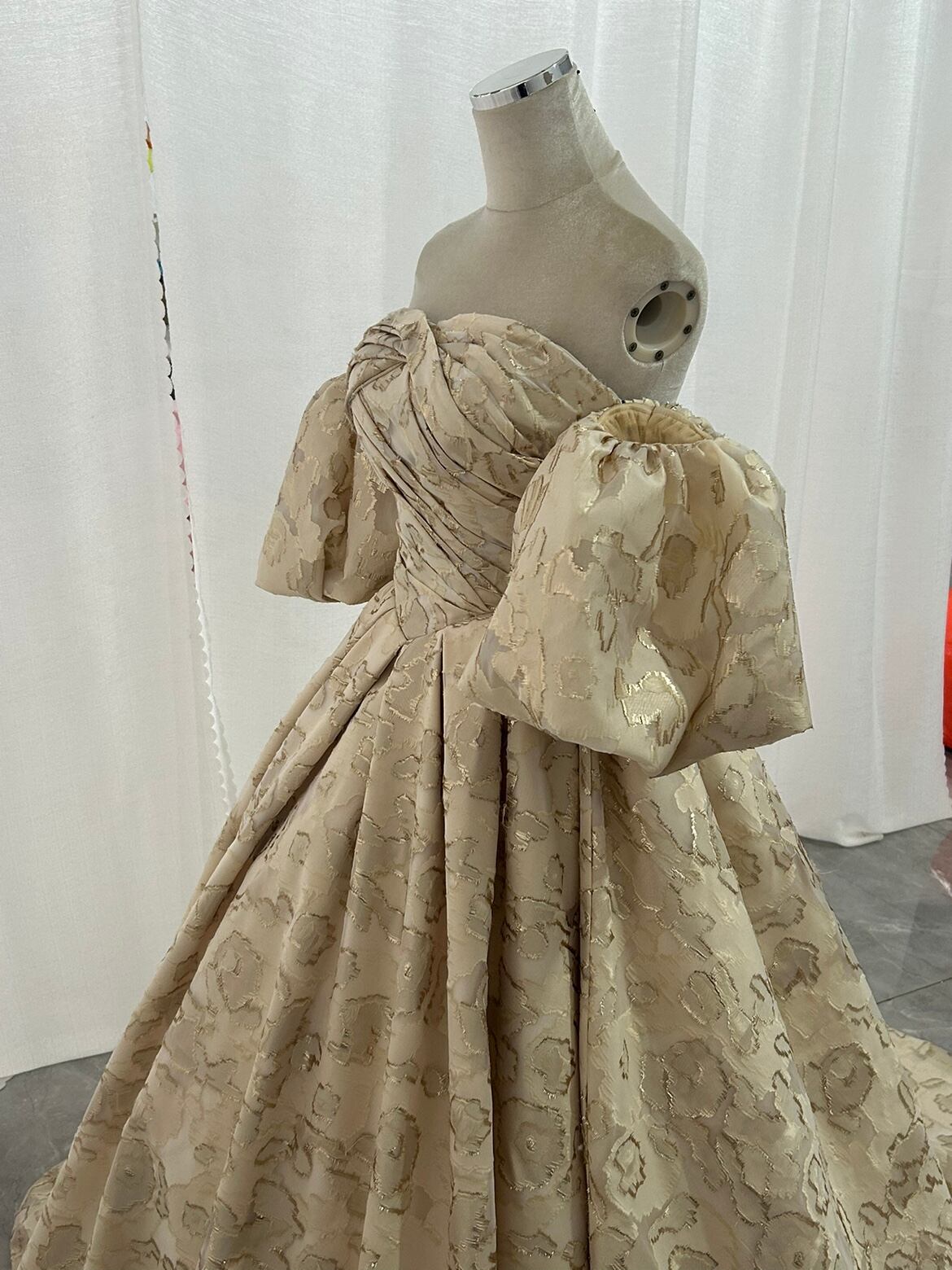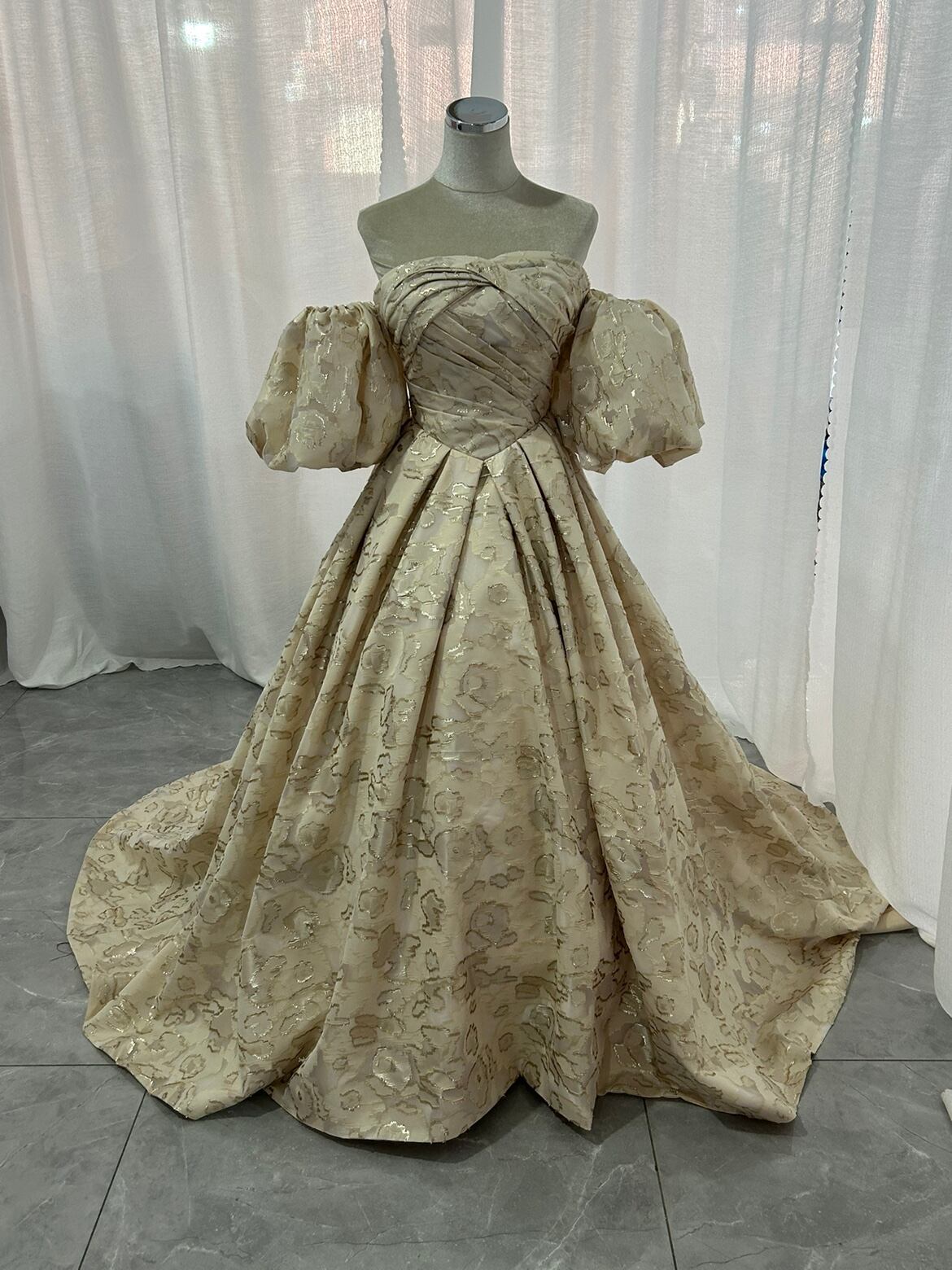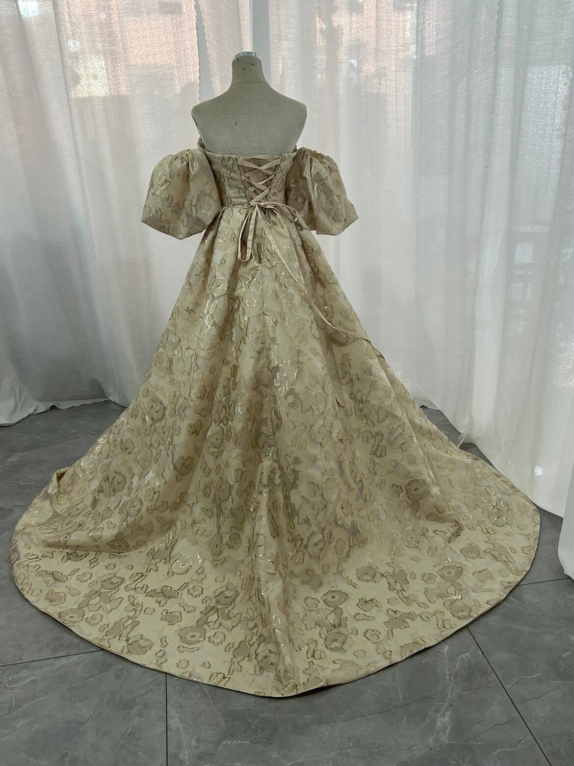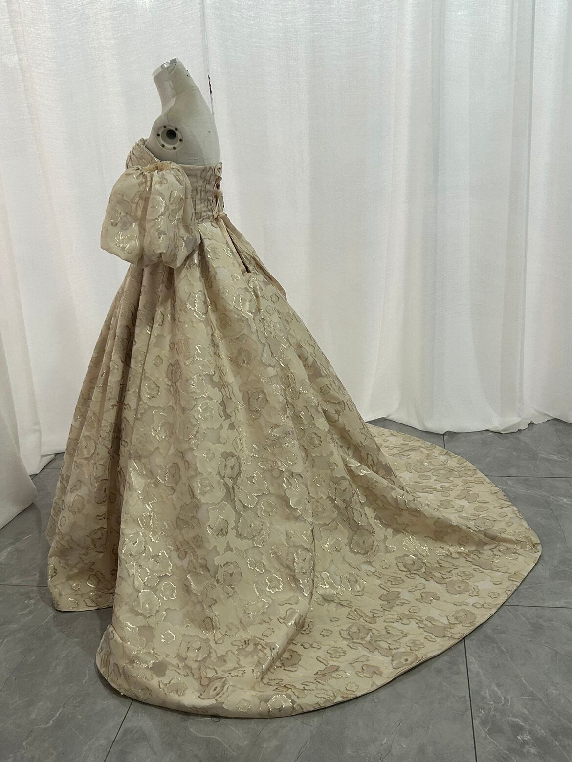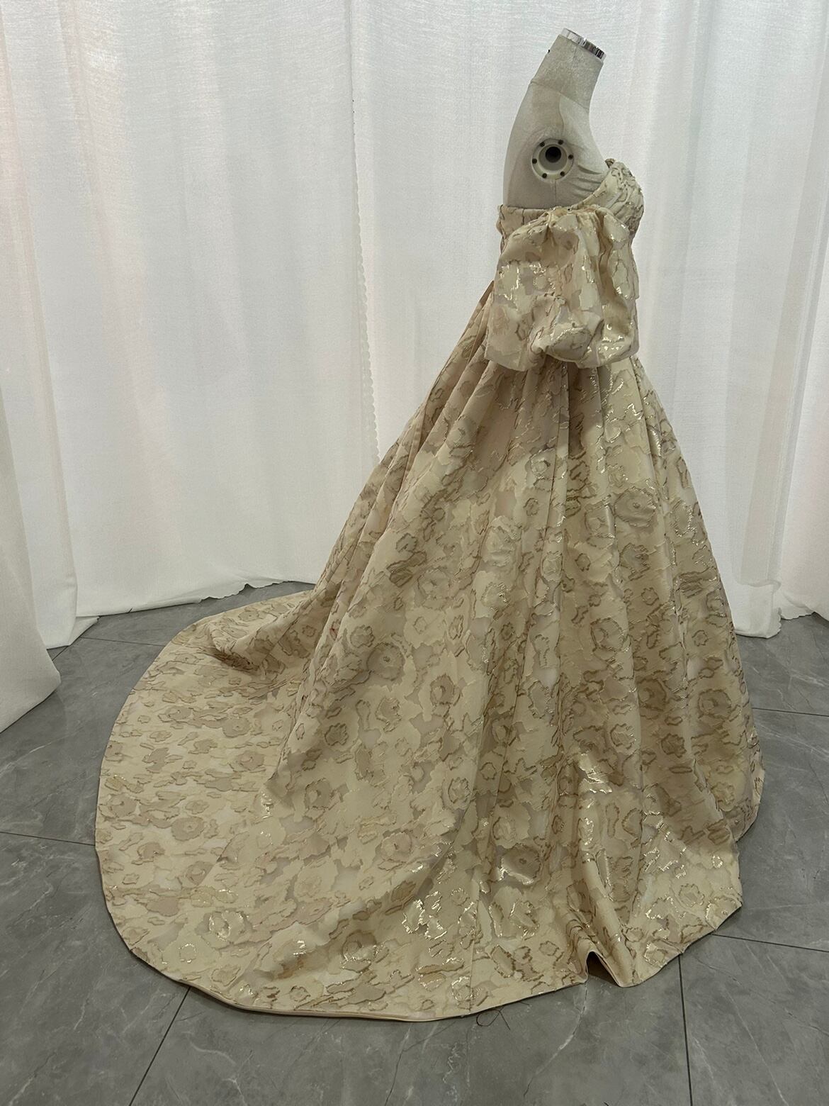 カラードレス ジャガード生地 パフスリーブドレス 編み上げ 薄シャンパン色 結婚式 エレガント フランス風