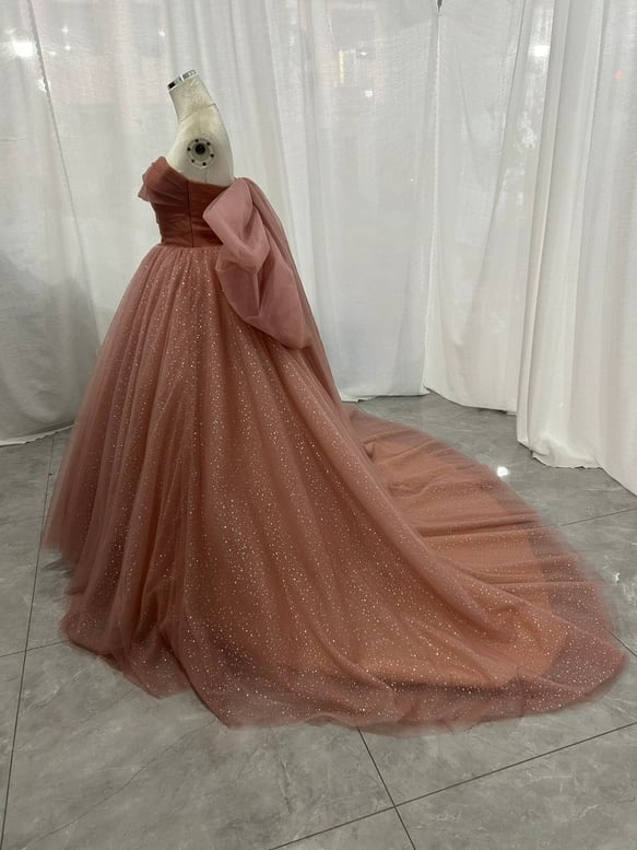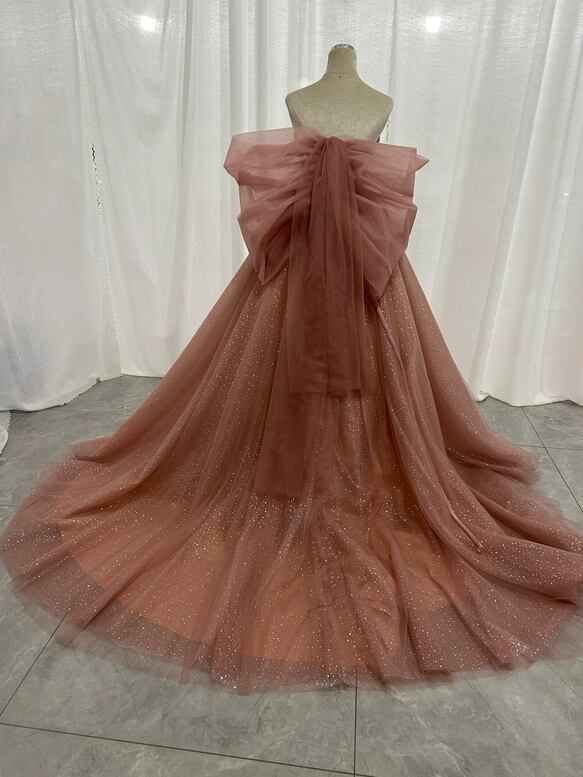 カラードレス くすみピンク キラキラチュール ベアトップ ふっくら柔らかなバックリボン 披露宴
