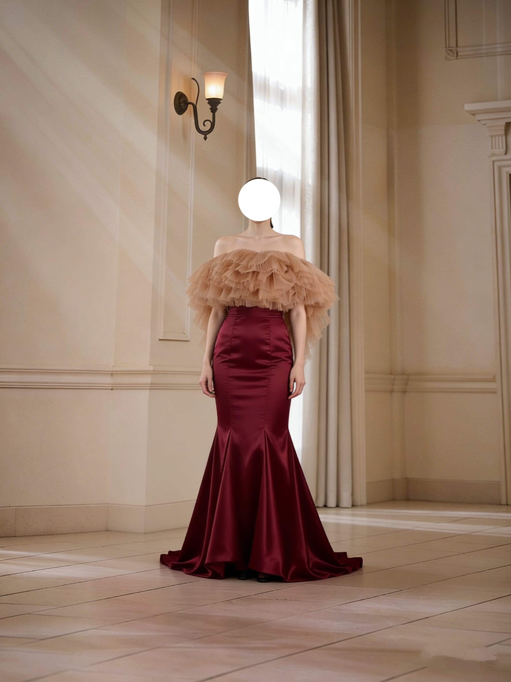 パーティードレス オフショルダー ボルドー色 マーメイドライン 光沢サテン 結婚式 前撮り ロングワンピース