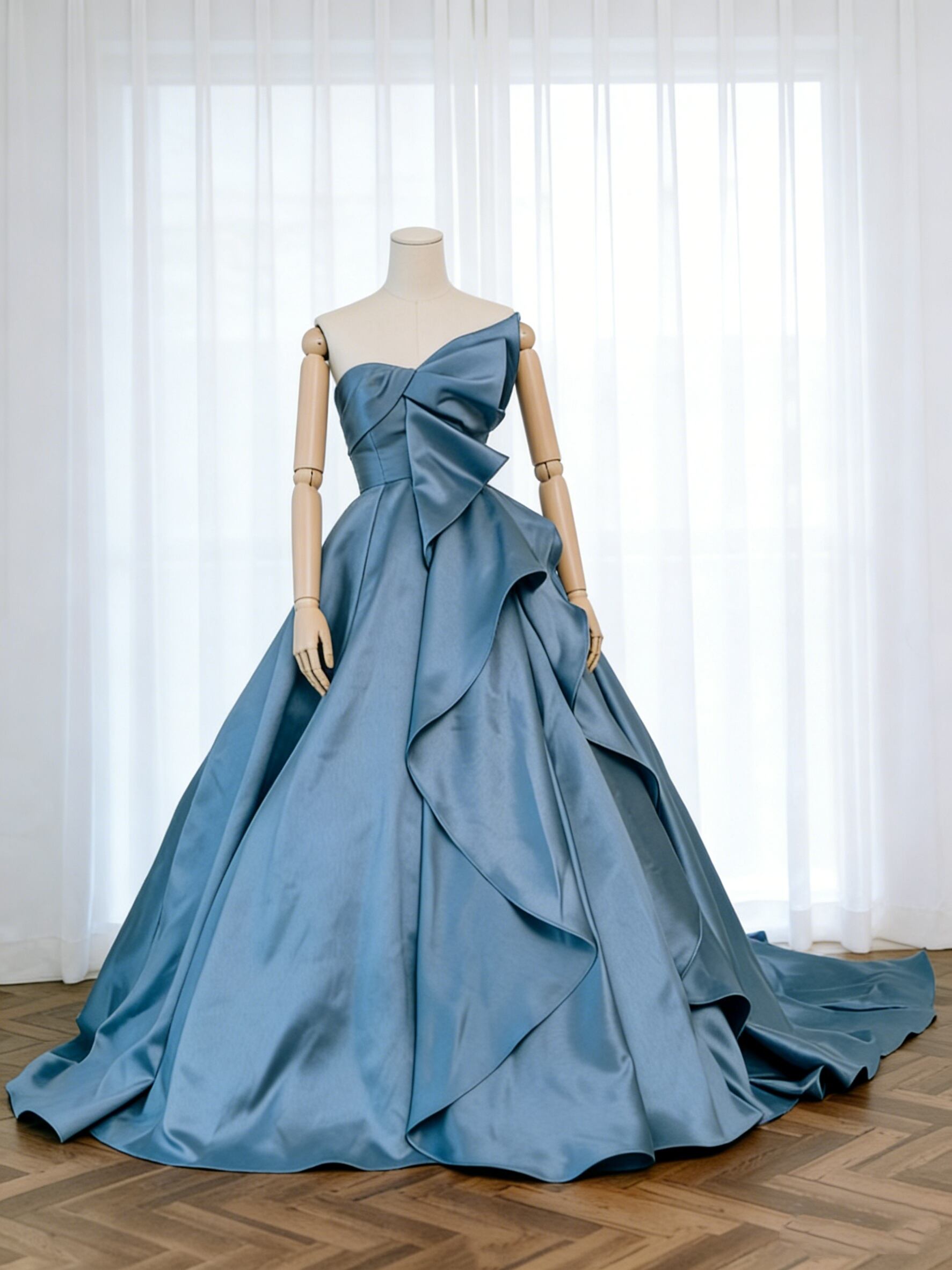 カラードレス ブルーグレー ラッフルフリル アシンメトリードレス ブライダル 光沢サテン ブライダル