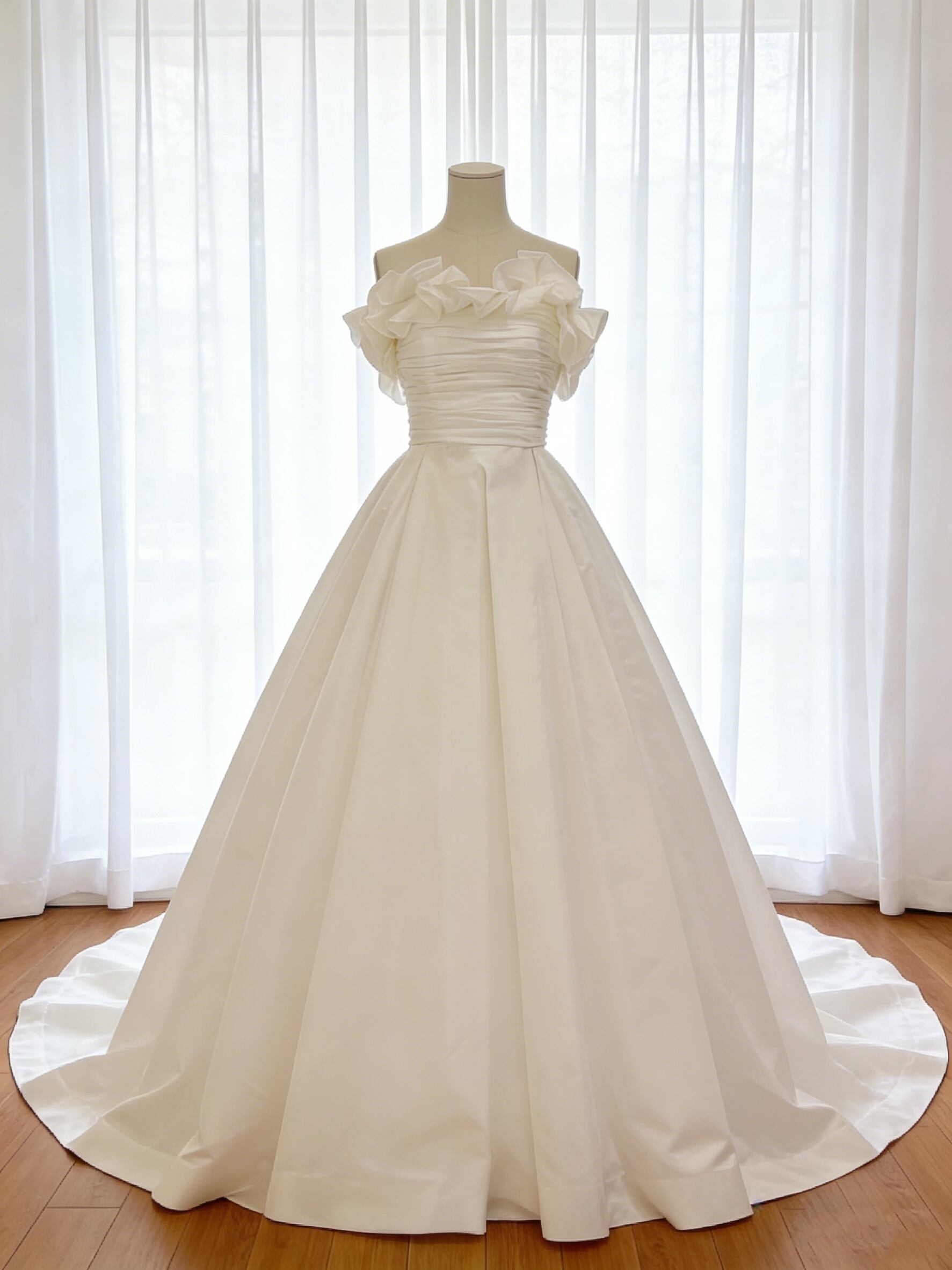 ウェディングドレス シルクタフタ ベアトップ Aライン ハンドドレープ 前撮り オフホワイト オーダーメイド