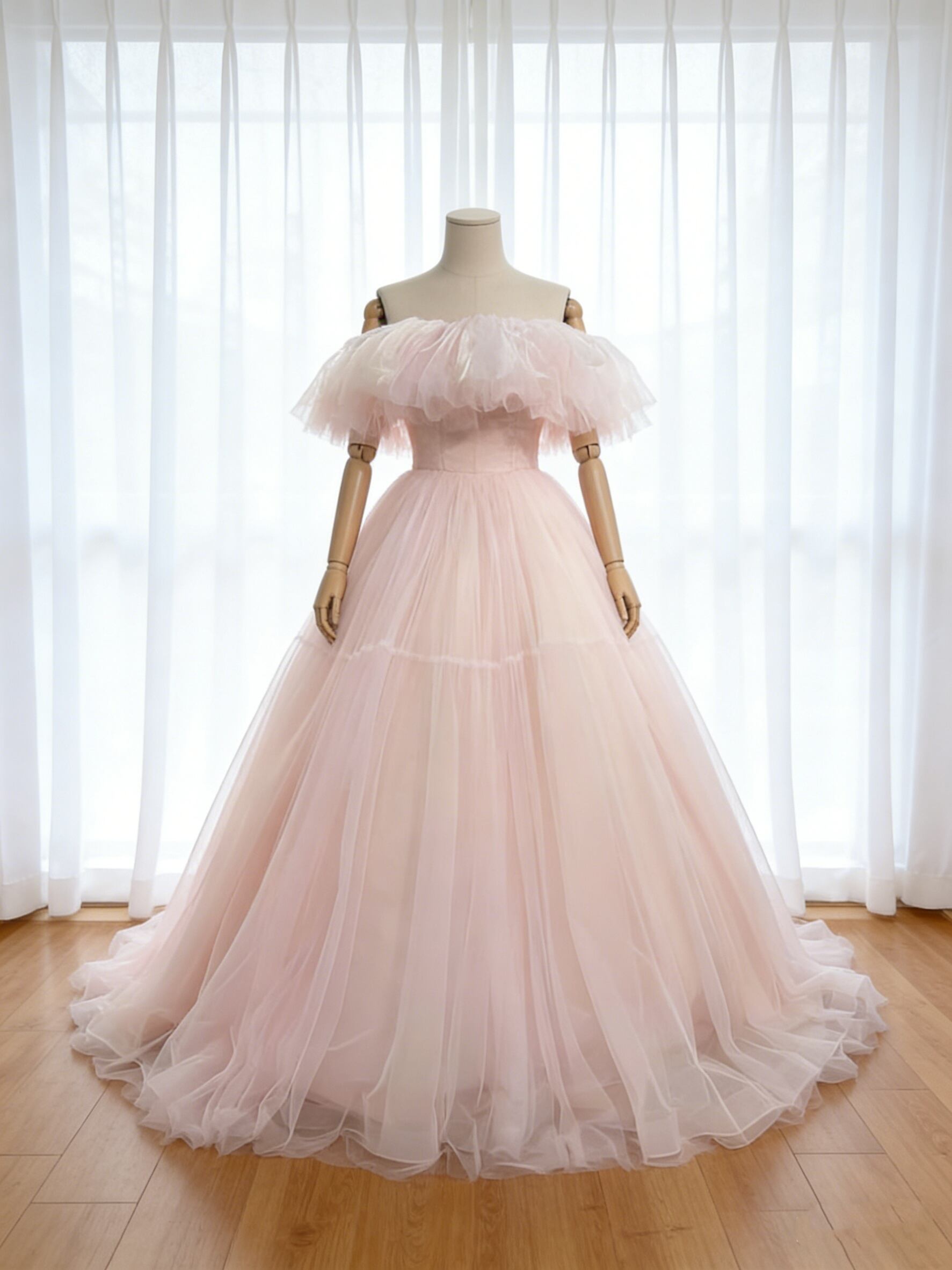 カラードレス オフショルダー ピンク 結婚式 プリンセスライン チュールスカート フレアスカート 前撮り