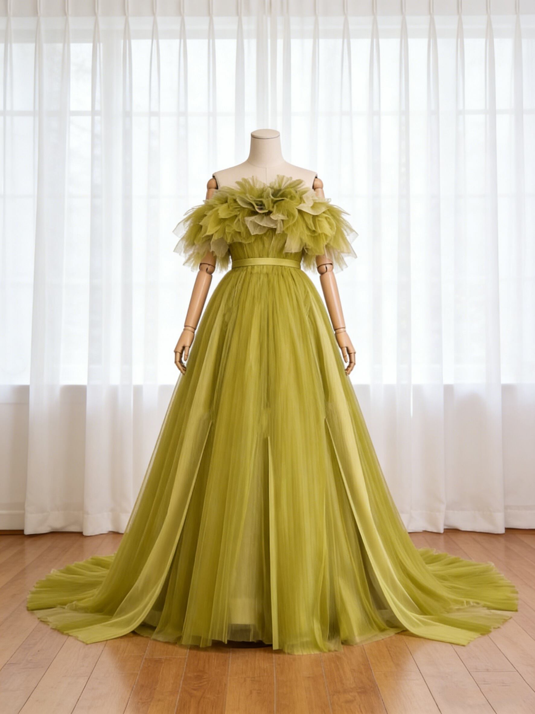 高品質!カラードレス グリーン オフショルダー 抜群におしゃれ度が際立つ プリーツドレス 前撮り