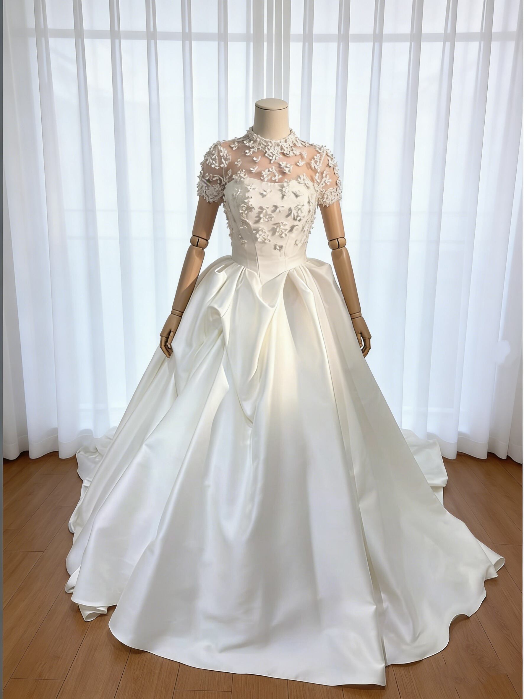 ウェディングドレス 半袖 ハイネック ミカドサテン 3D立体レース刺繍 結婚式/披露宴 ラッフルフリル