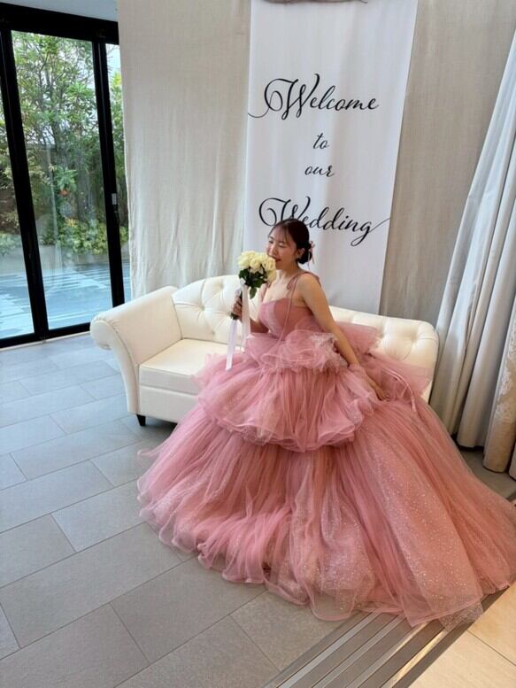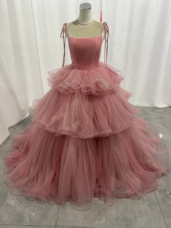 実例写真!カラードレス ピンク キラキラグリッターチュール ティアードのドレス プリンセスライン 編み上げ キャミソール