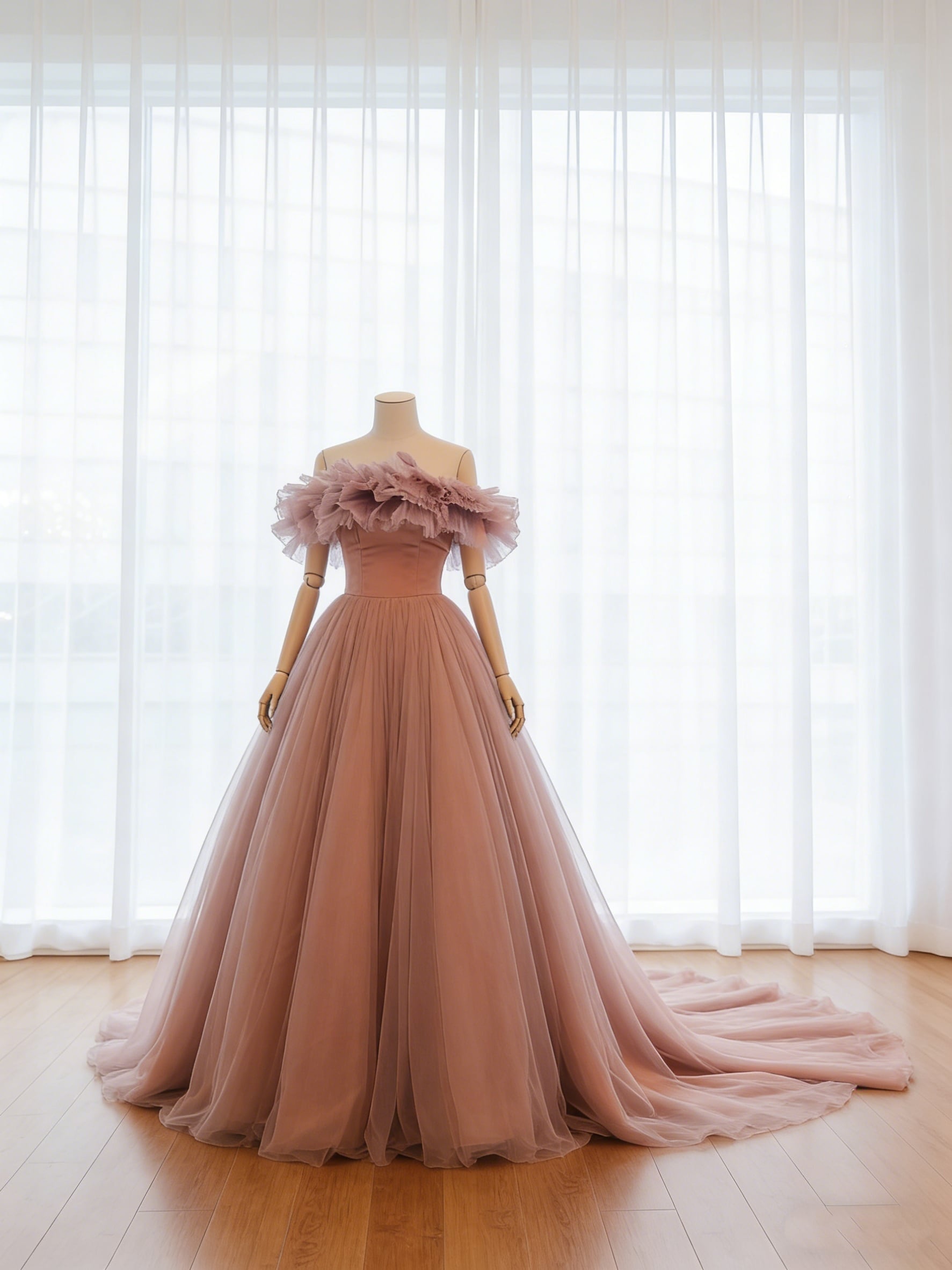 カラードレス ピンク チュールスカート フリルオフショルダー 前撮り 抜群におしゃれ度が際立つ 花嫁