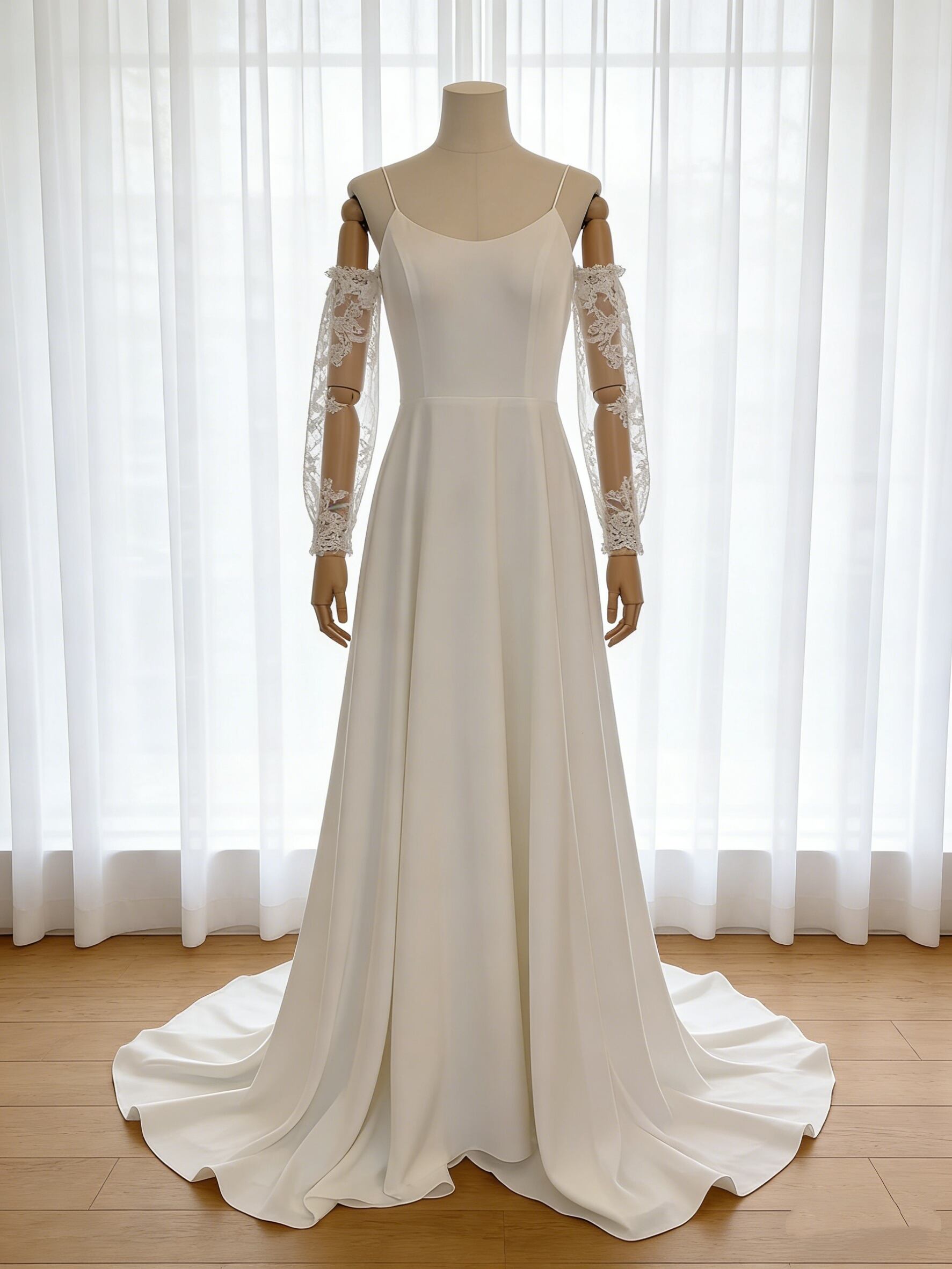 ウェディングドレス ロングスリーブ キャミソール クレープ生地 シアーな美しさ 上品な透け袖 披露宴