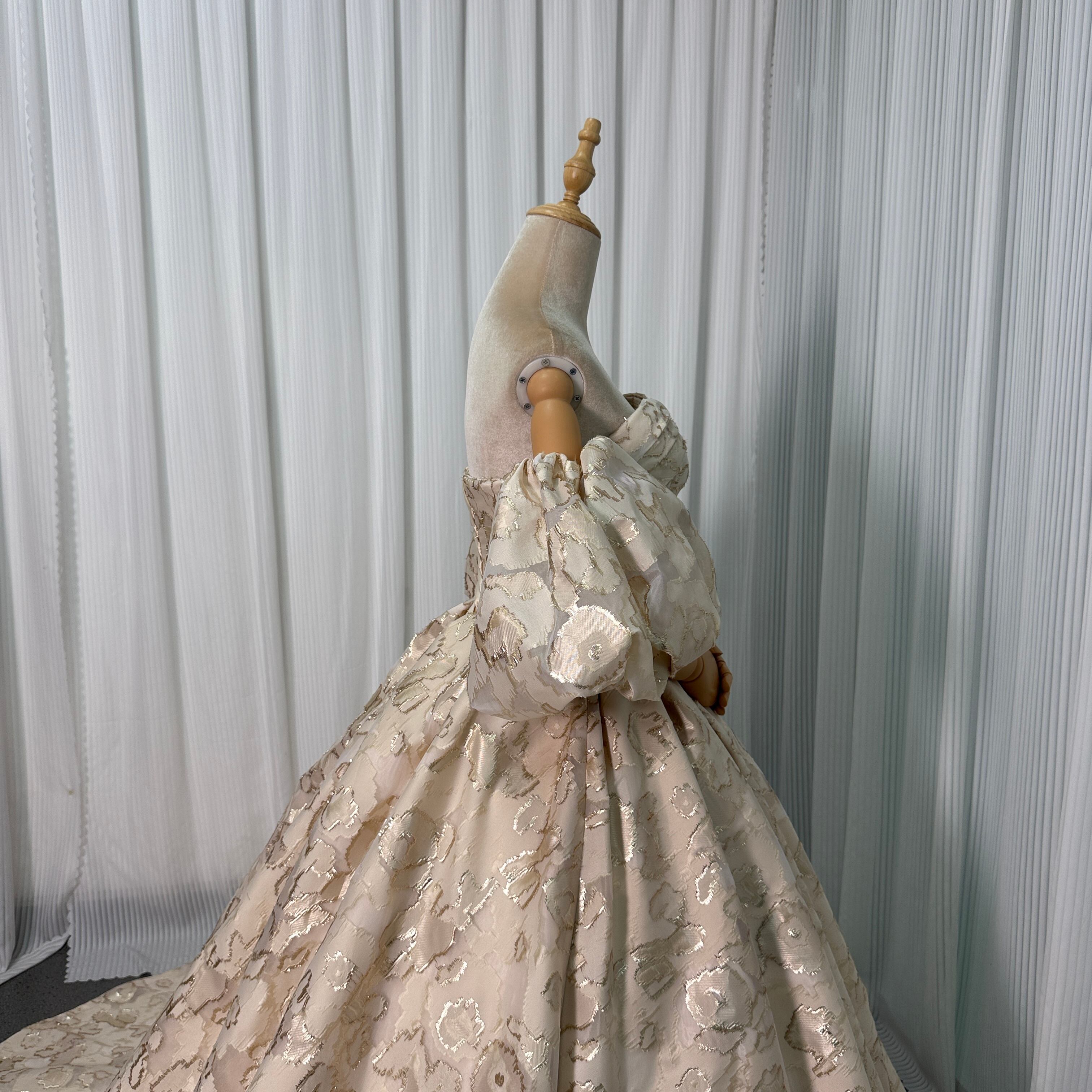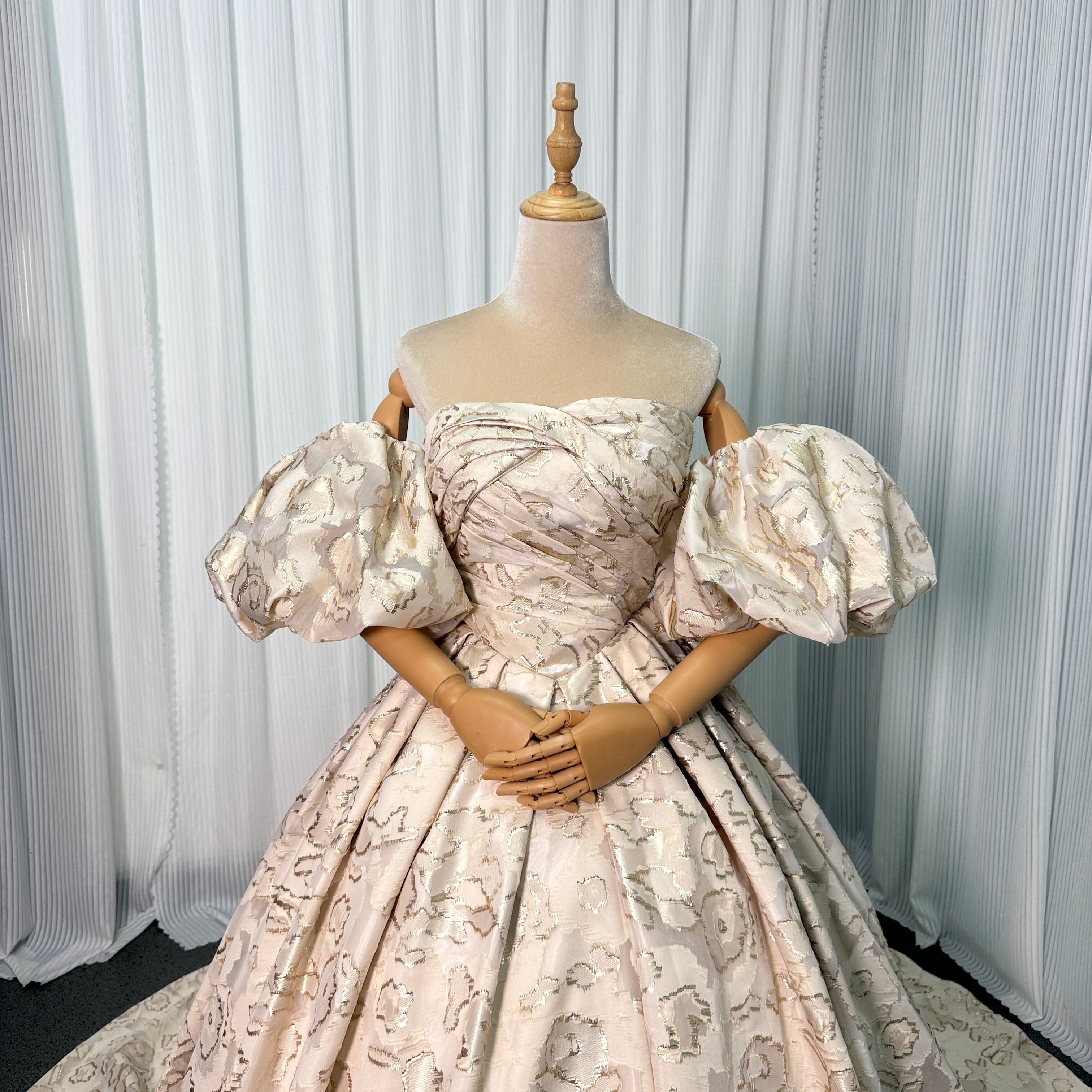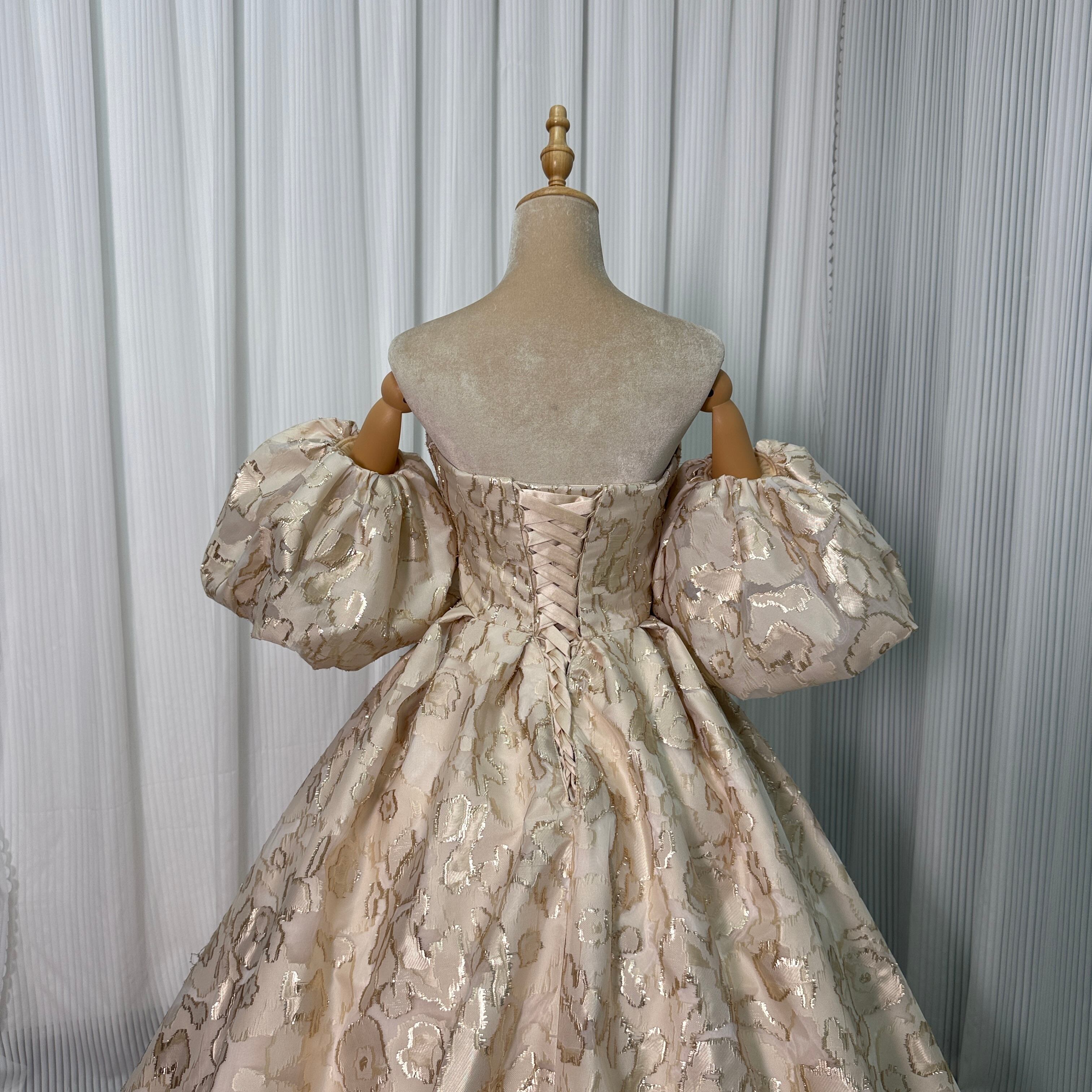 カラードレス ジャガード生地 パフスリーブドレス 編み上げ 薄シャンパン色 結婚式 エレガント フランス風
