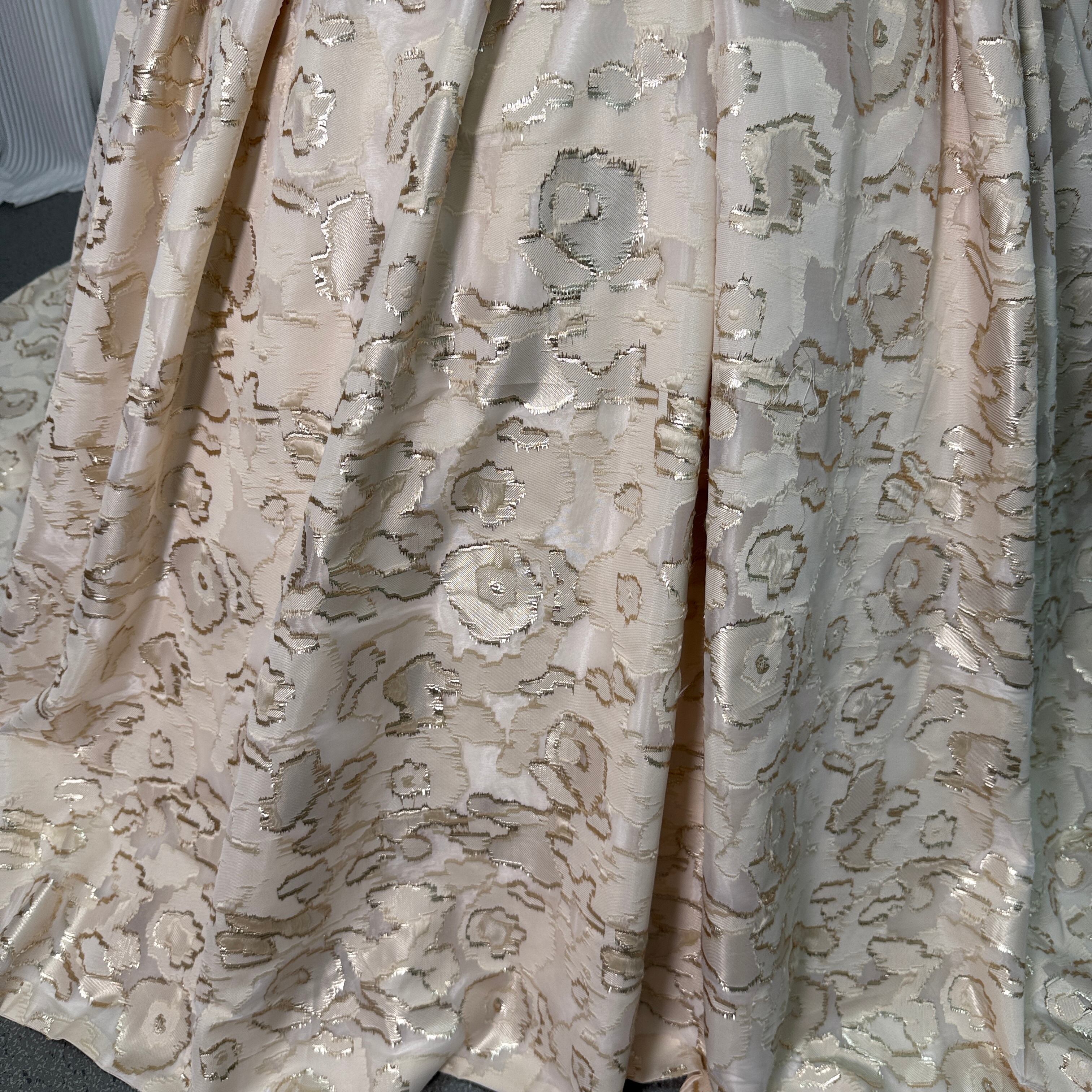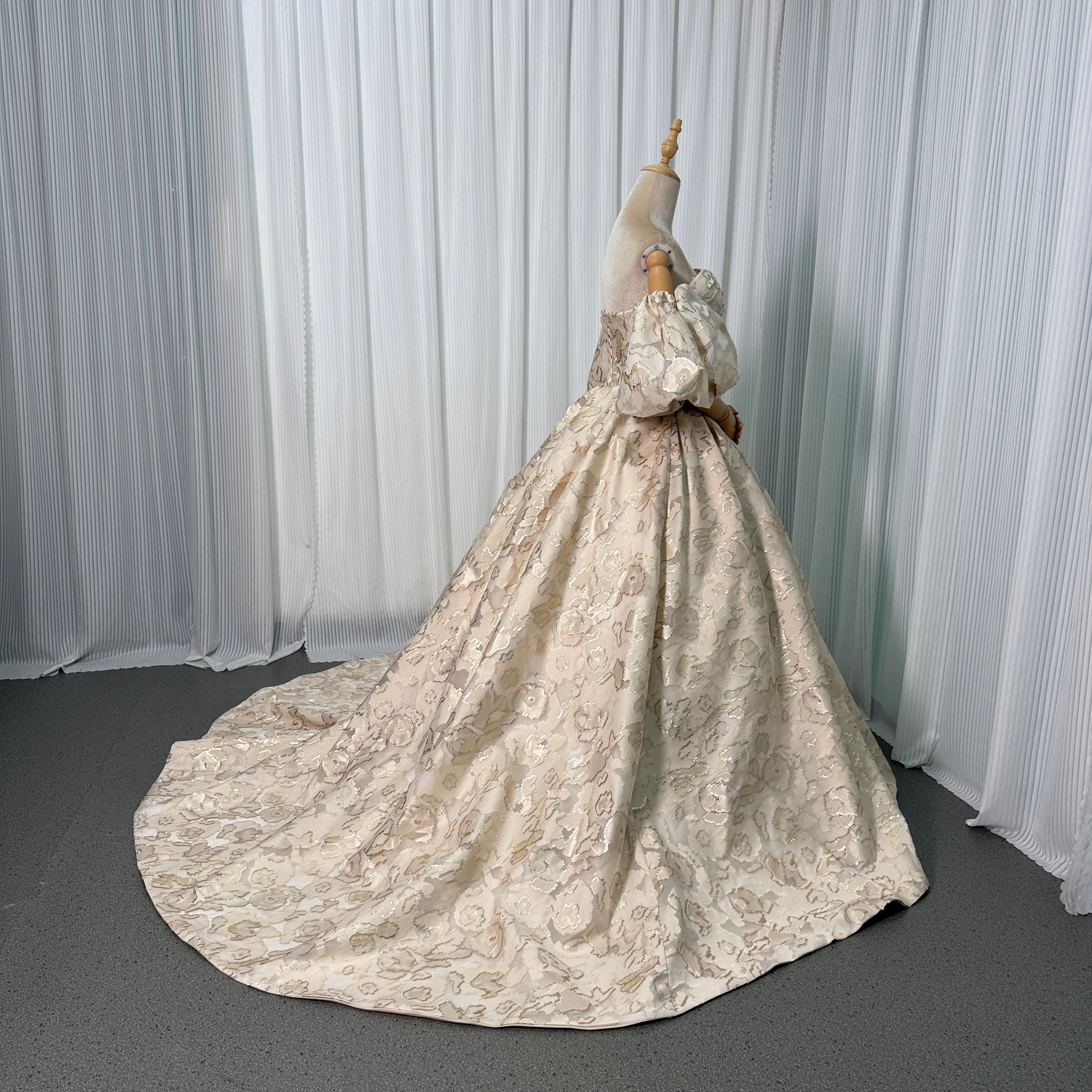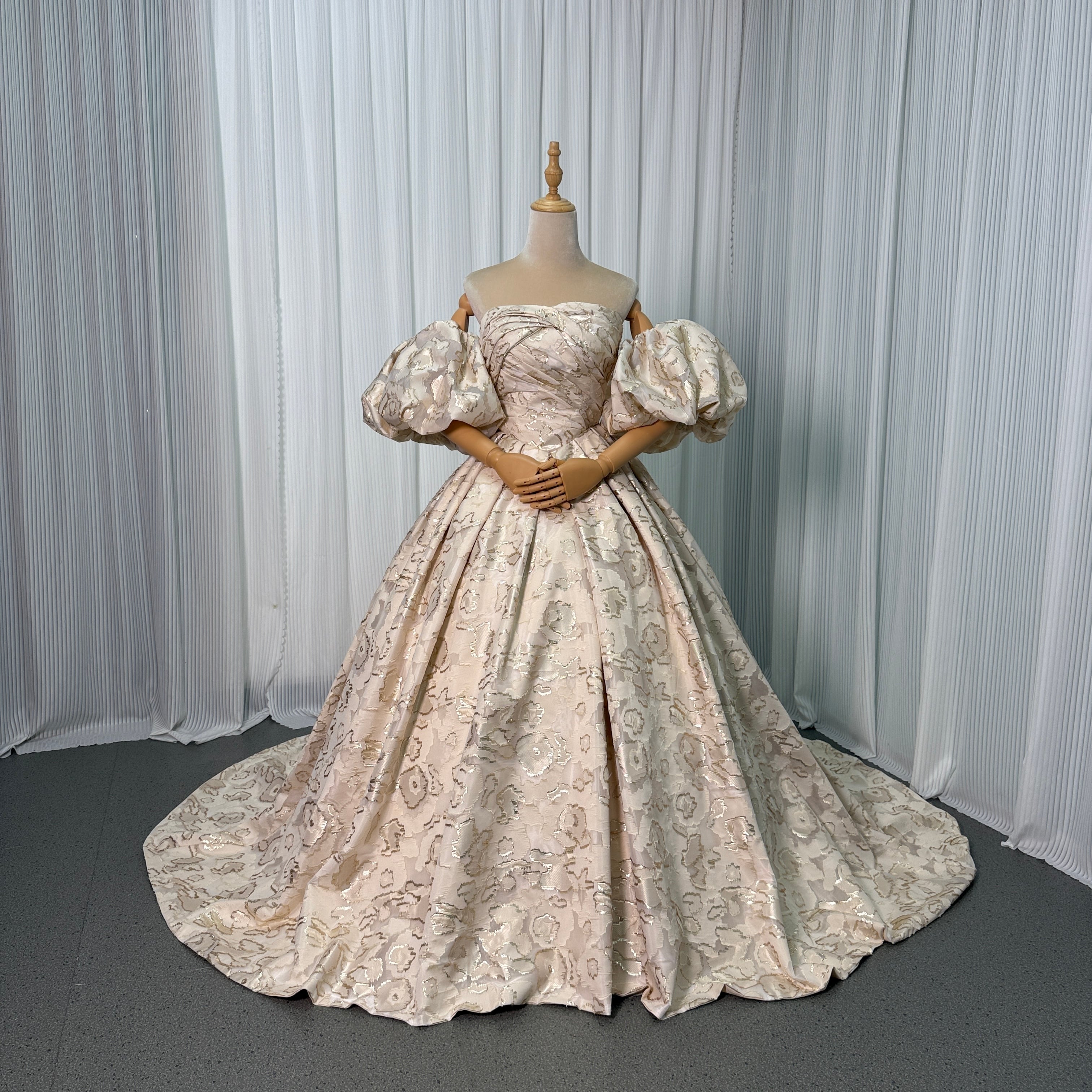 カラードレス ジャガード生地 パフスリーブドレス 編み上げ 薄シャンパン色 結婚式 エレガント フランス風