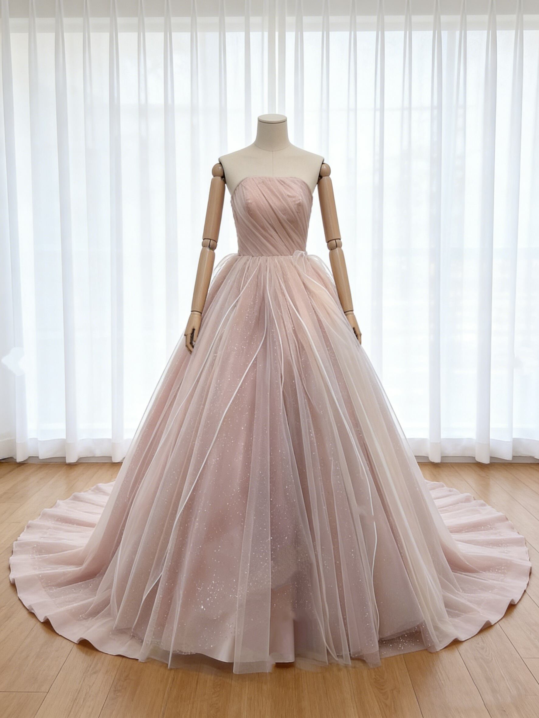 カラードレス 薄シャンパン色 ベアトップ ハンドドレープ キラキラチュール アシンメトリードレス 結婚式