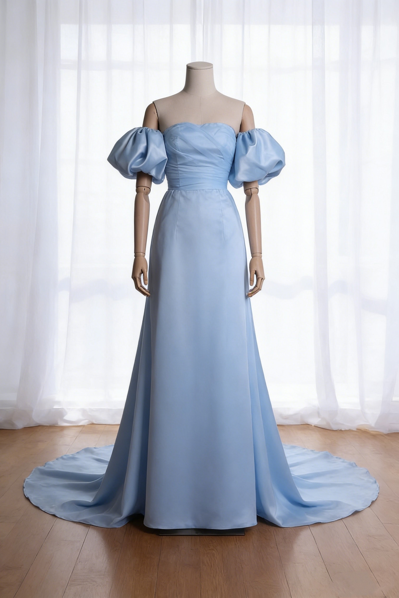 パーティードレス ブルー パフスリーブドレス 揺らめく裾 ハンドドレープ 前撮り スレンダーライン