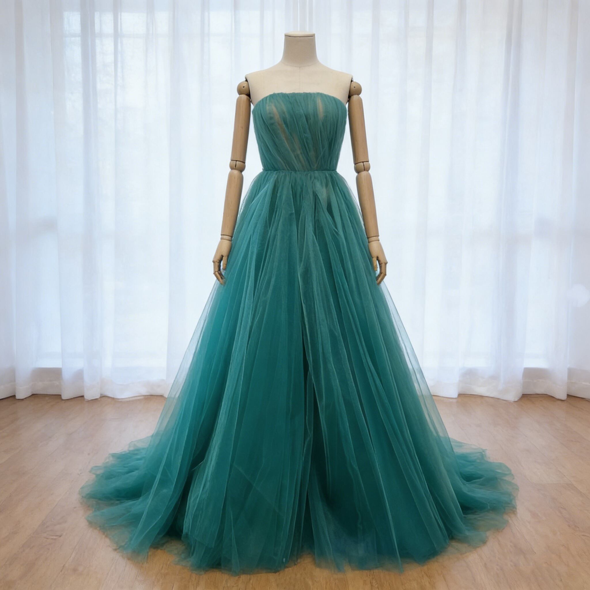 カラードレス グリーン スレンダーライン ベアトップ チュールスカート ブライダル アンティークなドレス