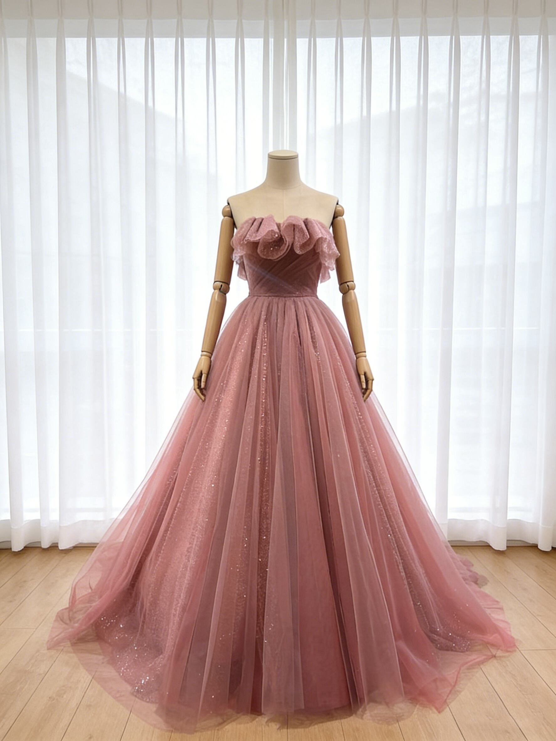 カラードレス ベアトップ ピンク キラキラグリッターチュール ハンドドレープ オートクチュール 結婚式/披露宴