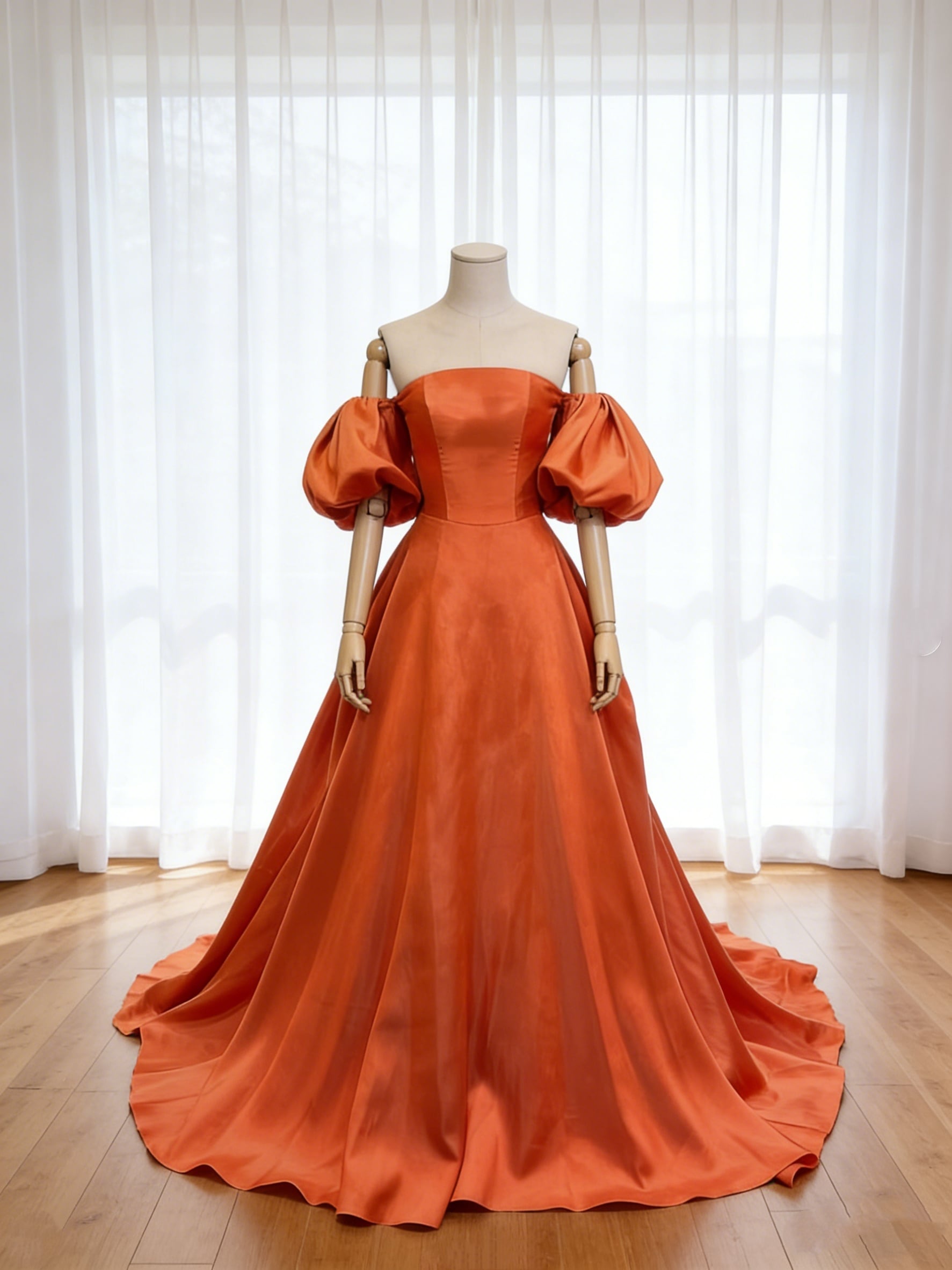 パーティードレス オレンジ パフスリーブドレス 細見えシルエット 光沢サテン 前撮り