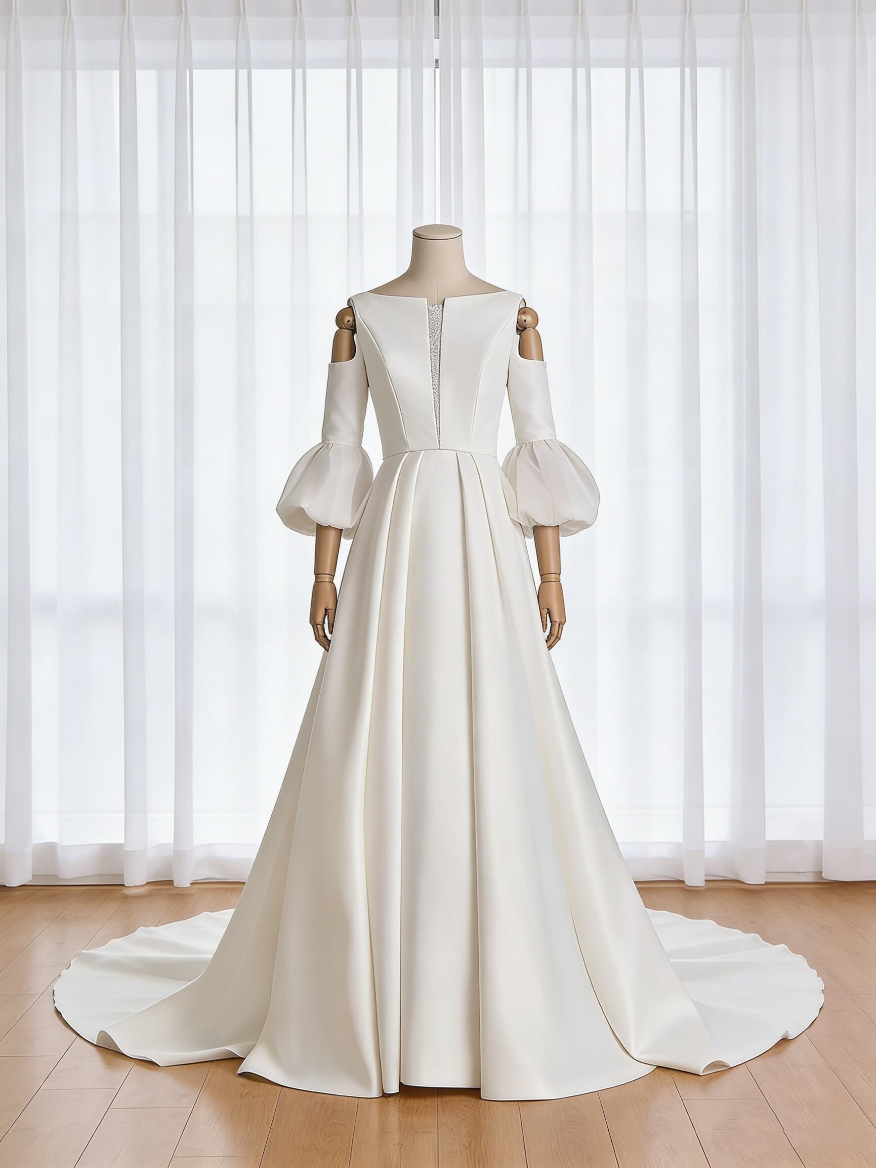 ウェディングドレス ロングスリーブ 光沢サテン ラウンドネック バルーンスリーブ 花嫁 Aライン ロングトレーン