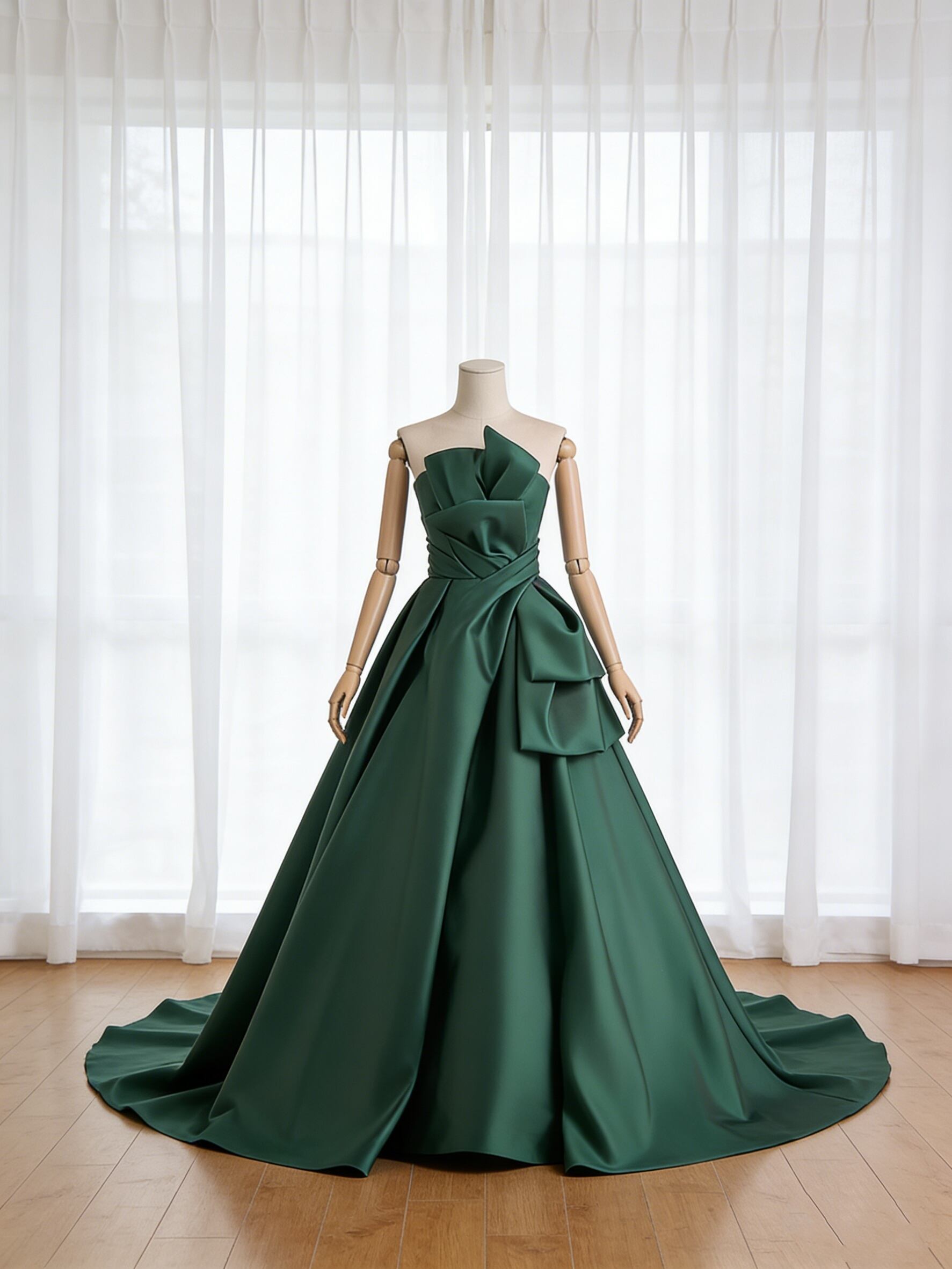 カラードレス ベアトップ グリーン アシンメトリードレス エレガント 前撮り ピアノ演奏会/音楽会