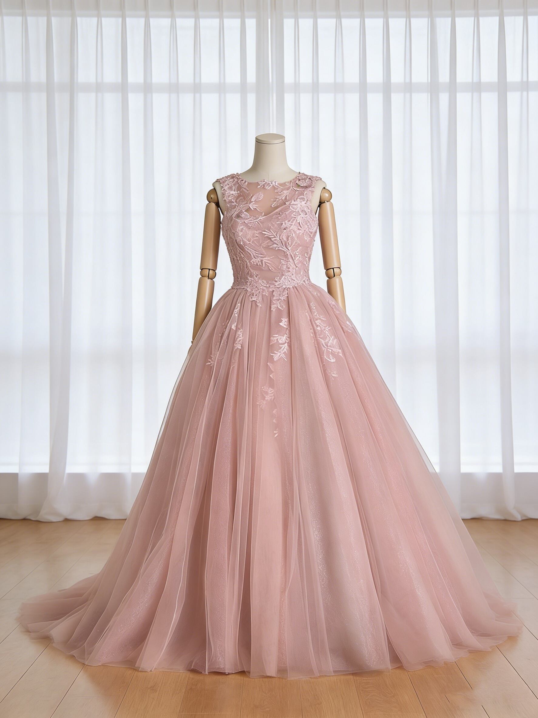 高品質!カラードレス ノースリーブ ピンク リーフ刺繍 フレアスカート チュールドレス 結婚式