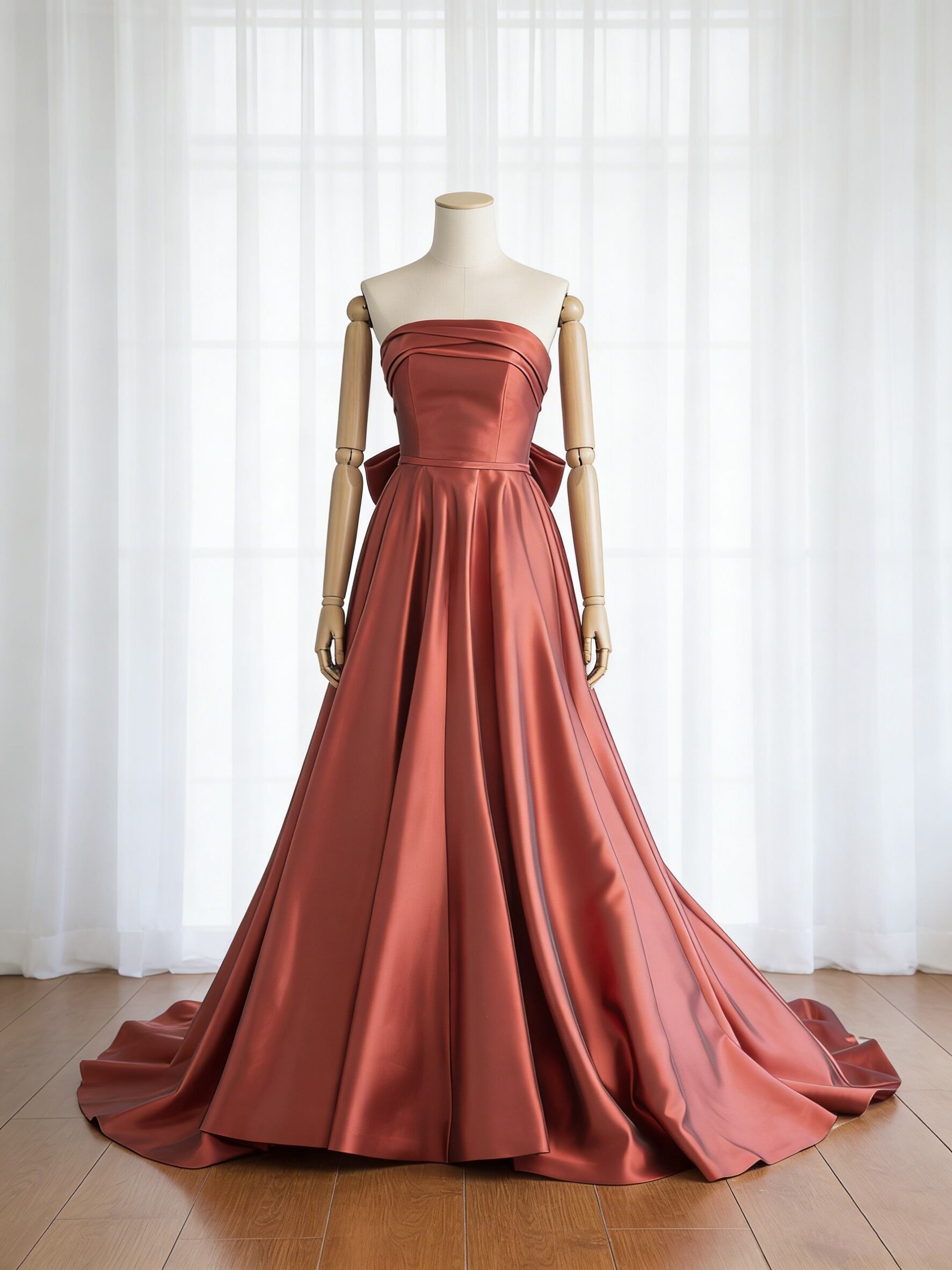 カラードレス ワインレッド ベアトップ ハンドドレープ ふっくら柔らかなバックリボン 光沢サテン