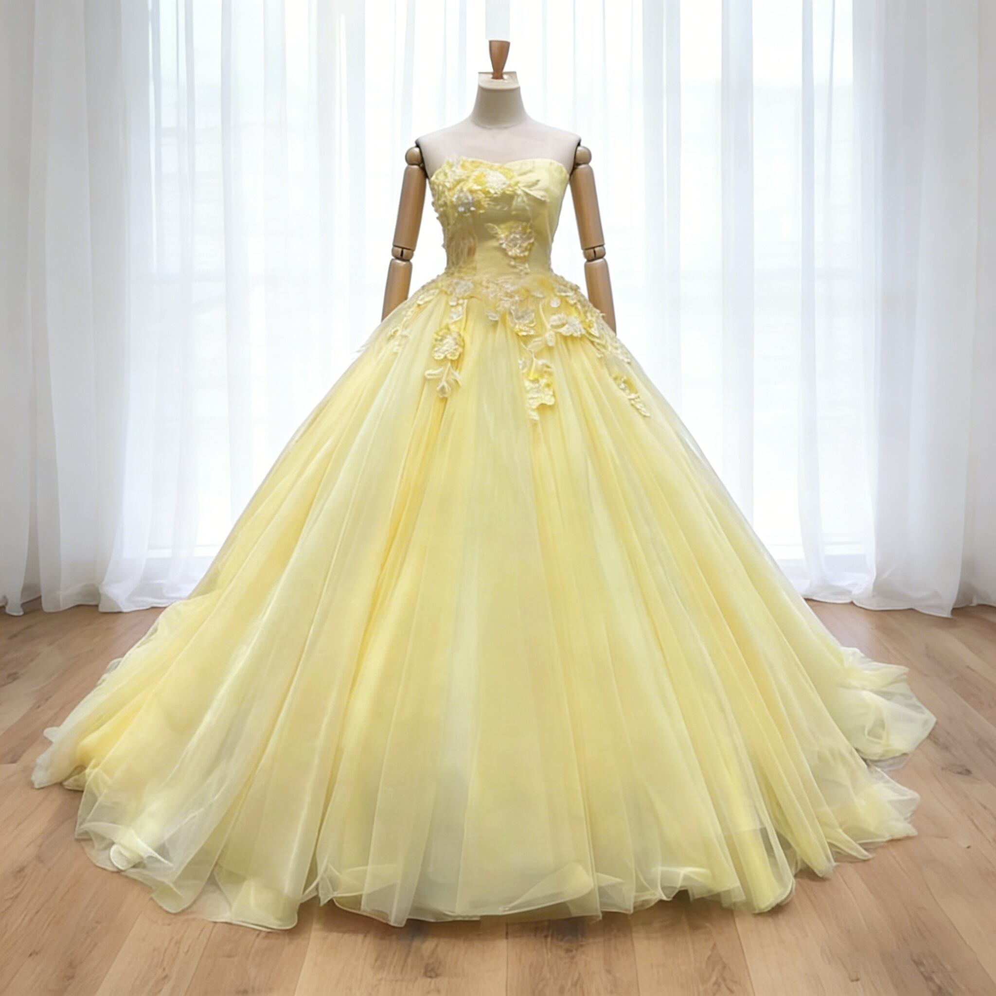 カラードレス ベアトップ イエロー 3D立体レース刺繍 前撮り ブライダル プリンセスライン結婚式