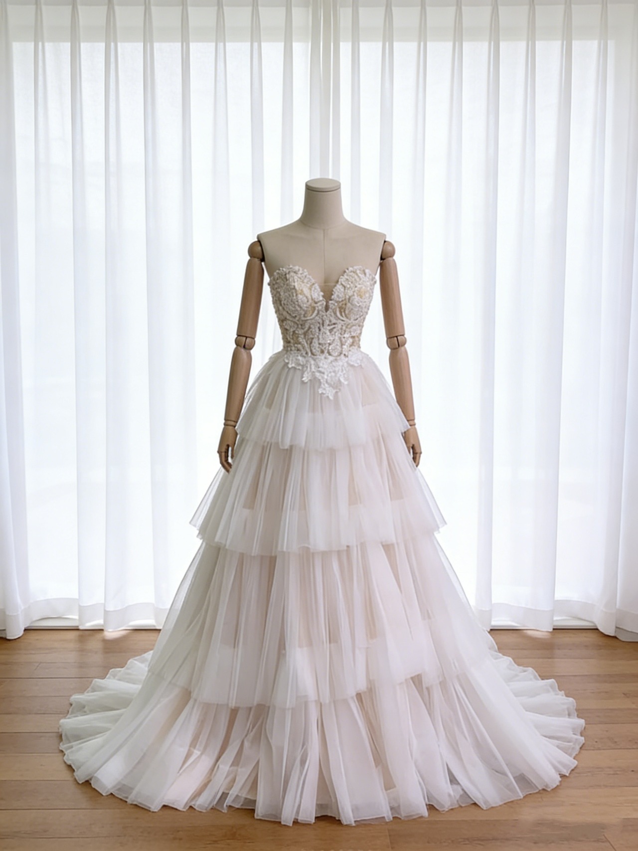 ウエディングドレス 海外挙式ドレス 3D立体レース刺繍 ティアードのドレス 結婚式 柔らかく重ねたチュールスカート