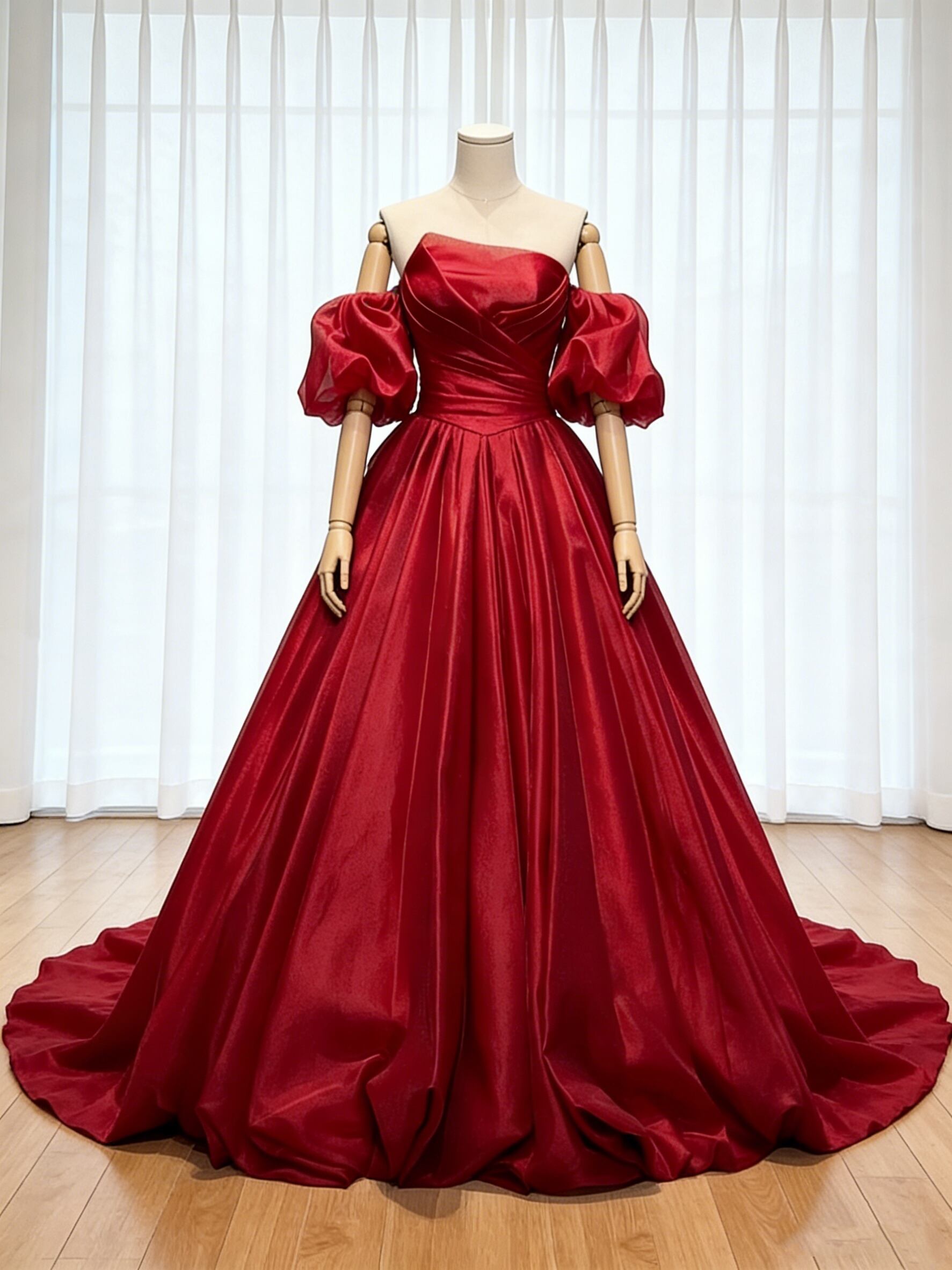 カラードレス ワインレッド バルーンスリーブ 光沢サテン エレガント クラシカル 前撮り トレーン