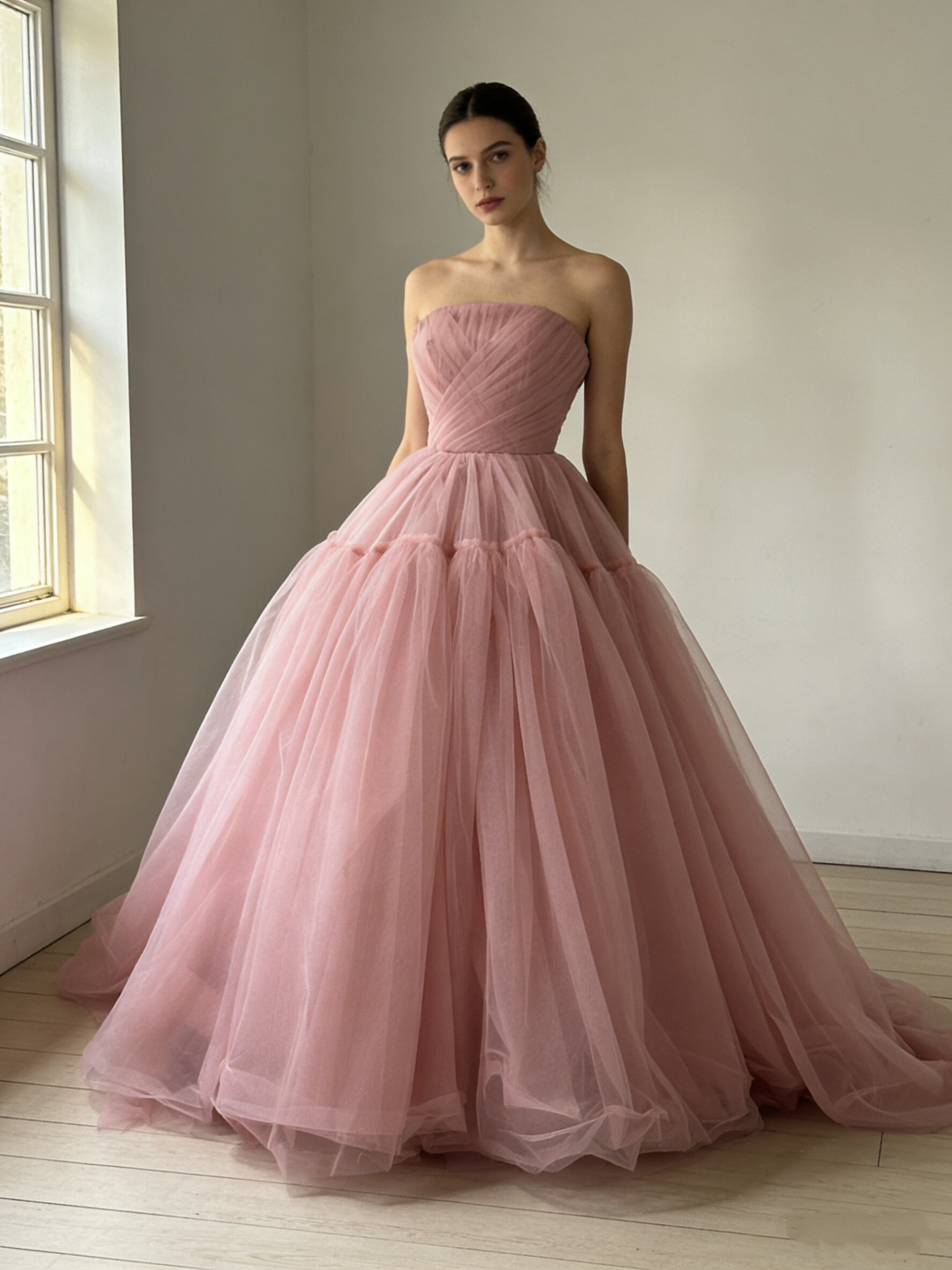 カラードレス ベアトップ ピンク ハンドドレープ ふわふわドレス ファスナー 花嫁 結婚式