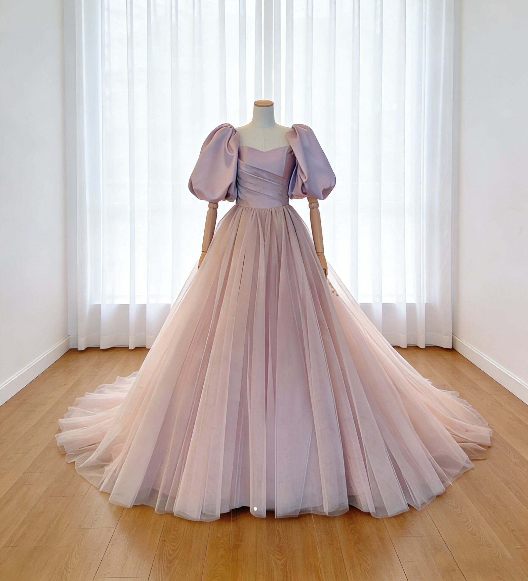 カラードレス ピンク パフスリーブドレス プリンセスライン 柔らかく重ねたチュールスカート 結婚式 豪奢