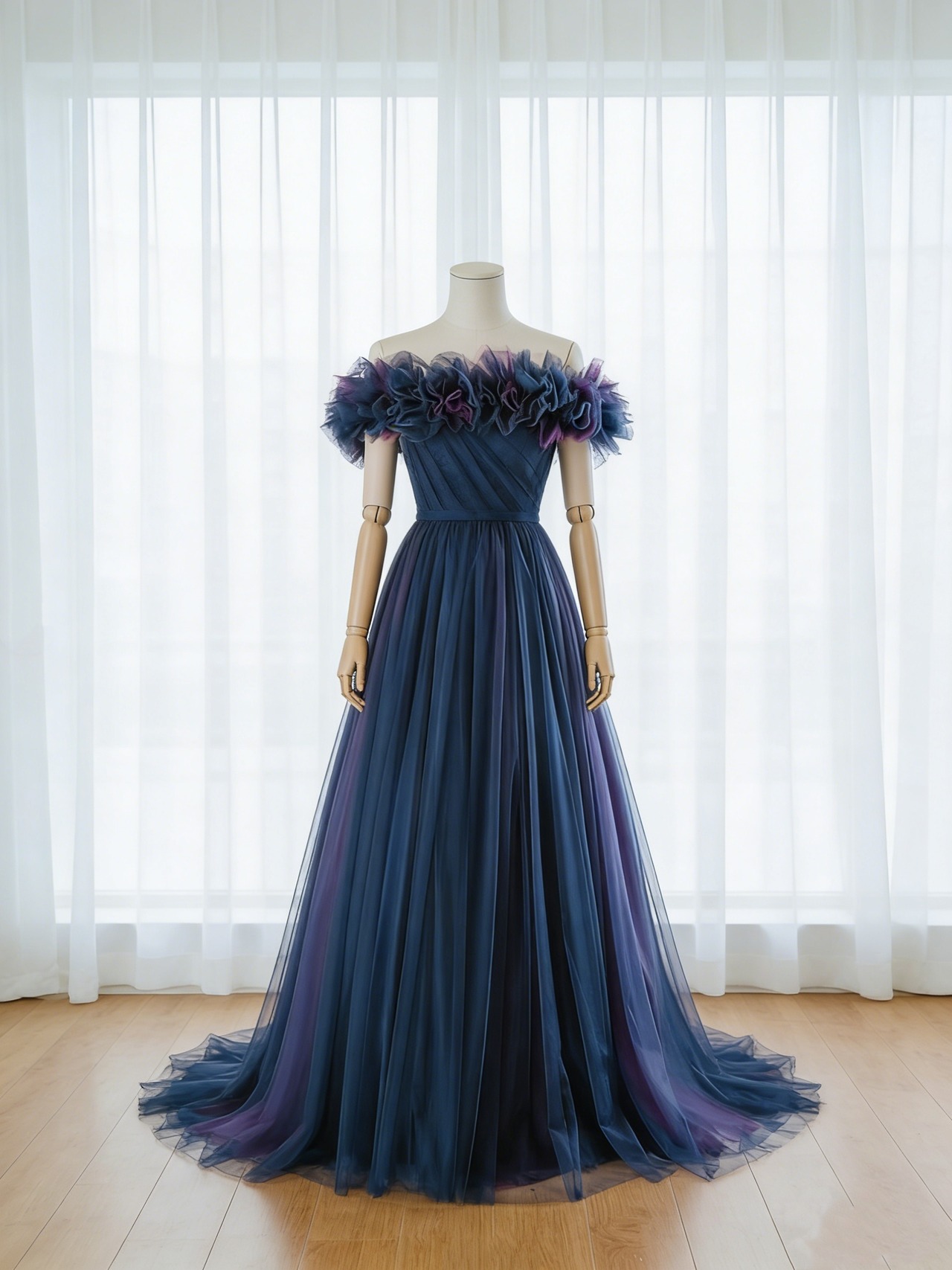 上品!カラードレス ネイビー Aライン 二次会 取り外し可能なオフショルダー アンティークなドレス ブライダル