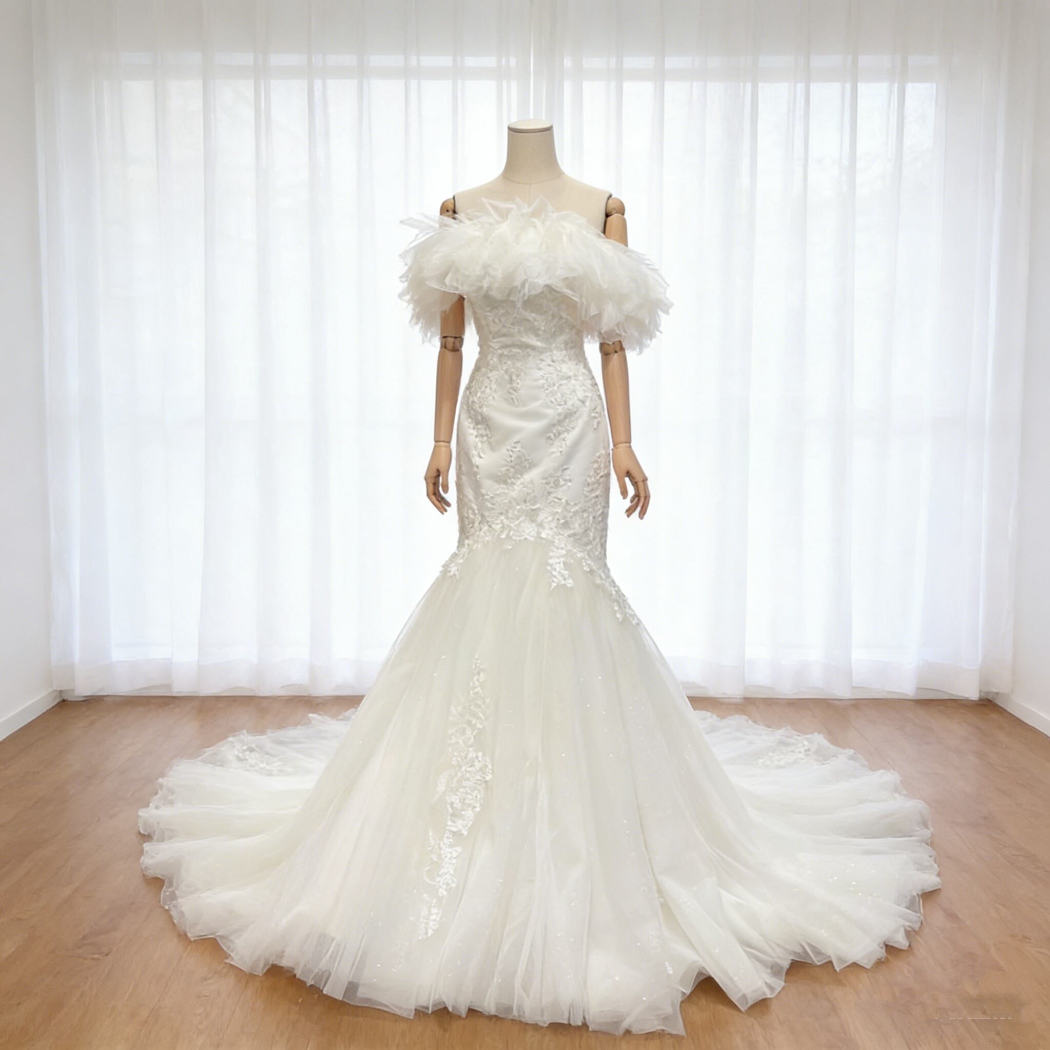 ウェディングドレス オフショルダー マーメイドライン ロングトレーン チュールスカート リーフ刺繍 花嫁