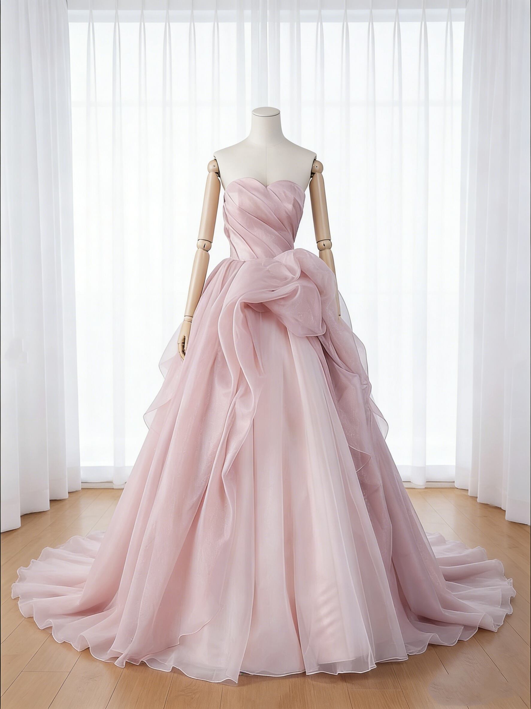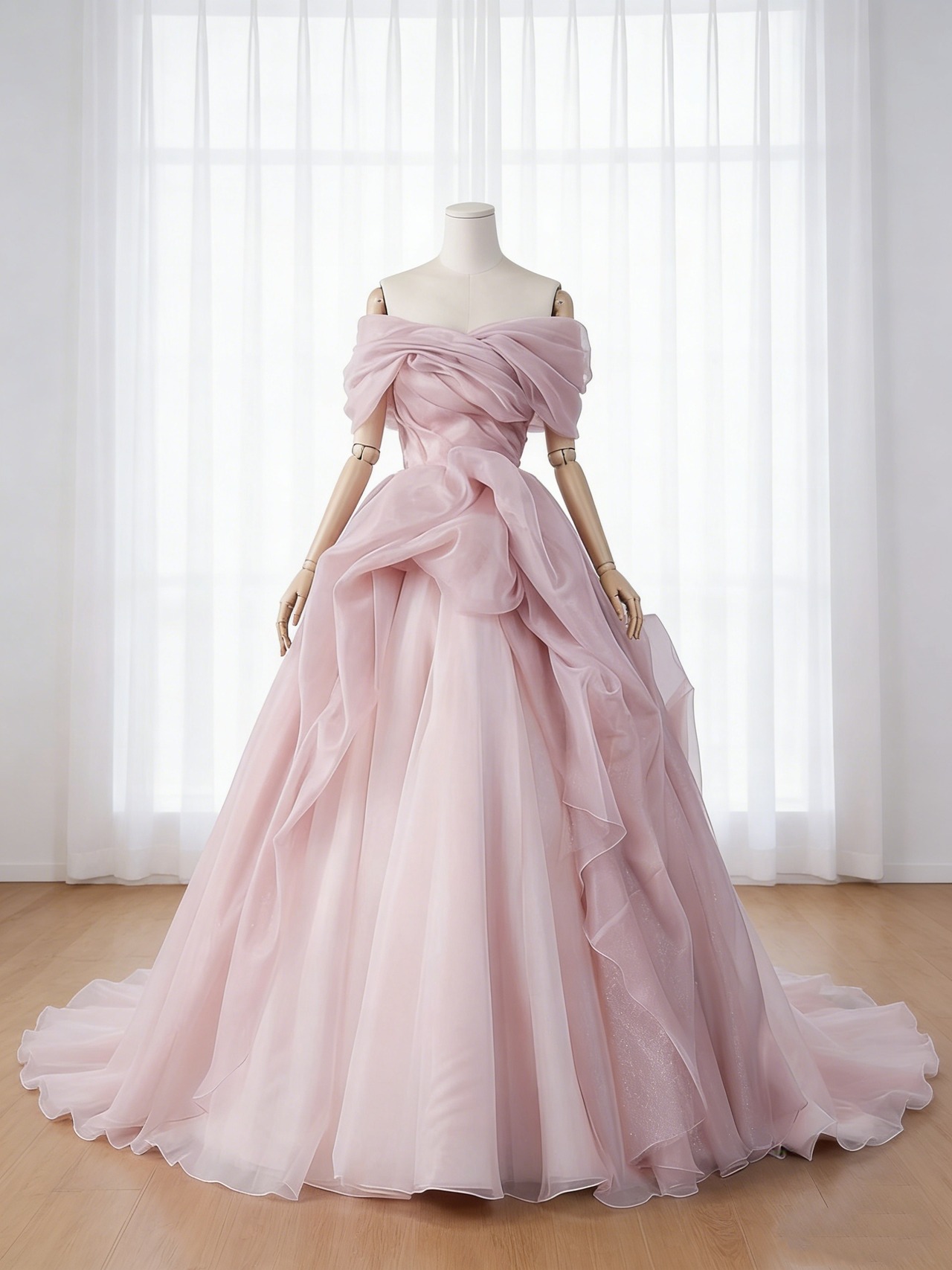 カラードレス ピンク 取り外し可能なオフショルダー アシンメトリードレス ハンドドレープ 楊柳オーガンジー