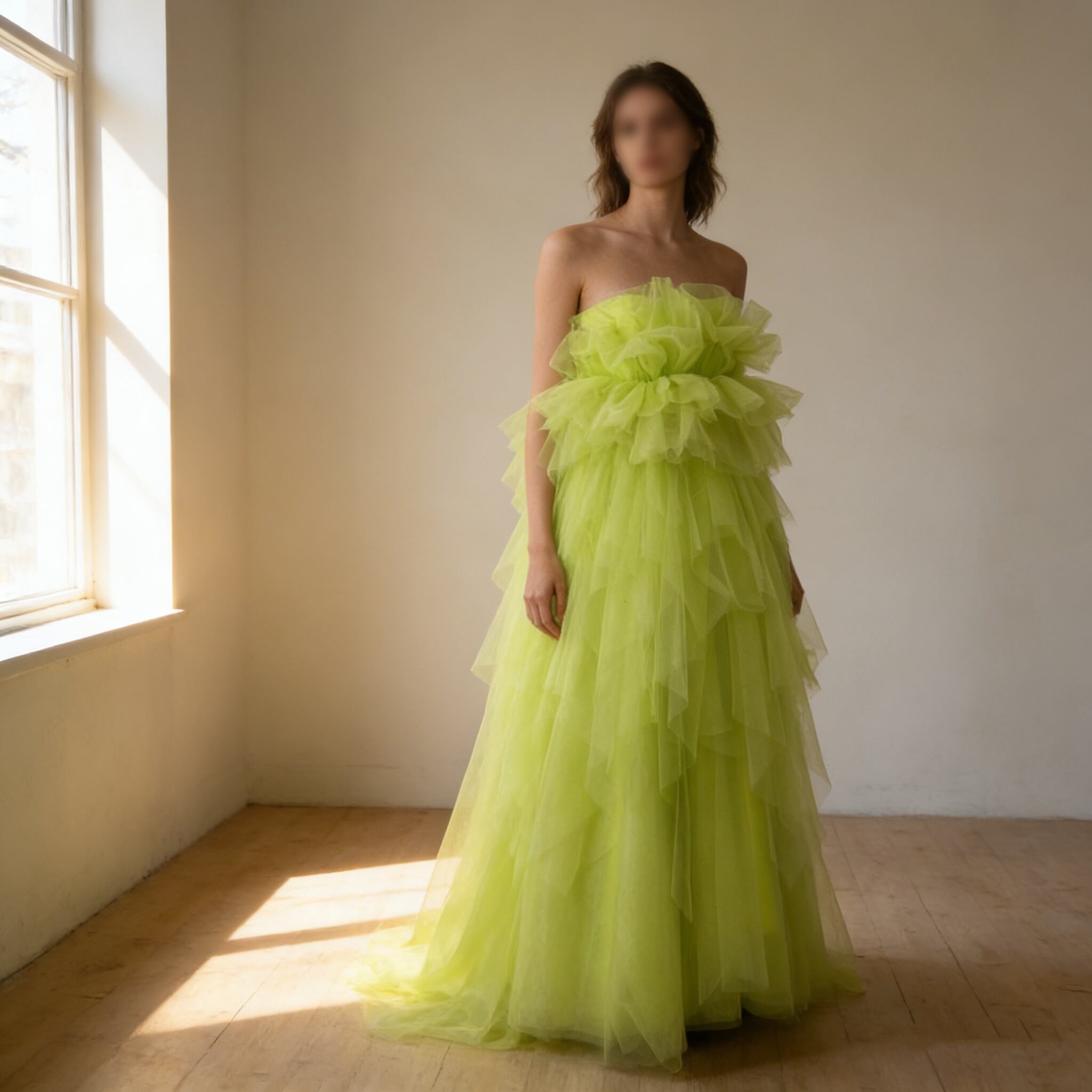 カラードレス ベアトップ グリーン アシンメトリードレス 編み上げ プリンセスライン 前撮り 二次会