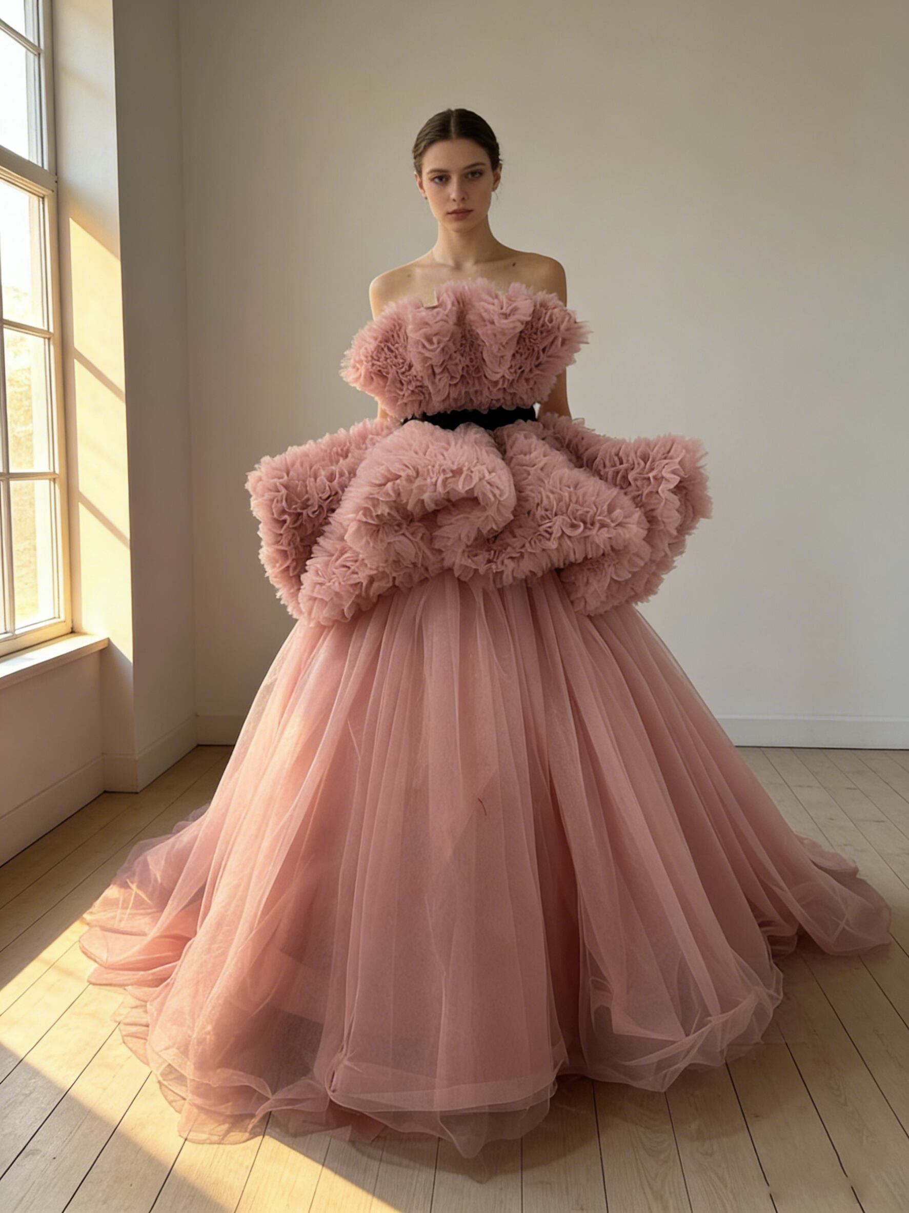 ウエディングドレス ベアトップ プリンセスライン ピンク チュールスカート 結婚式 抜群におしゃれ度が際立つ ふわふわドレス