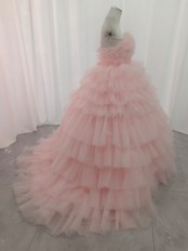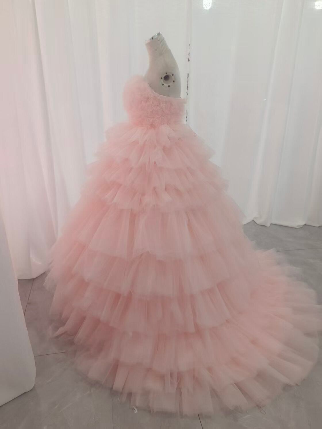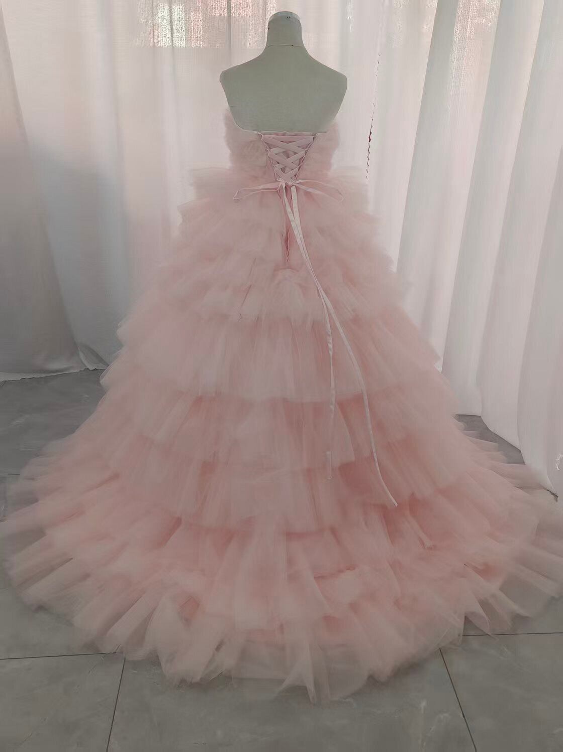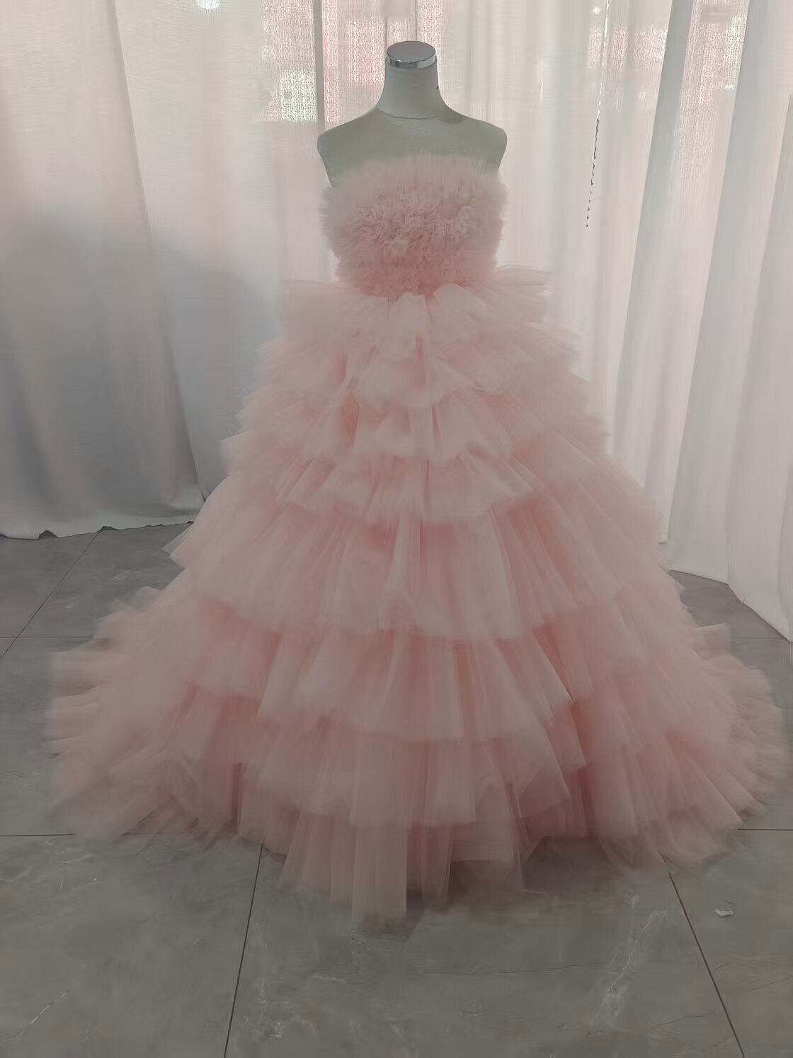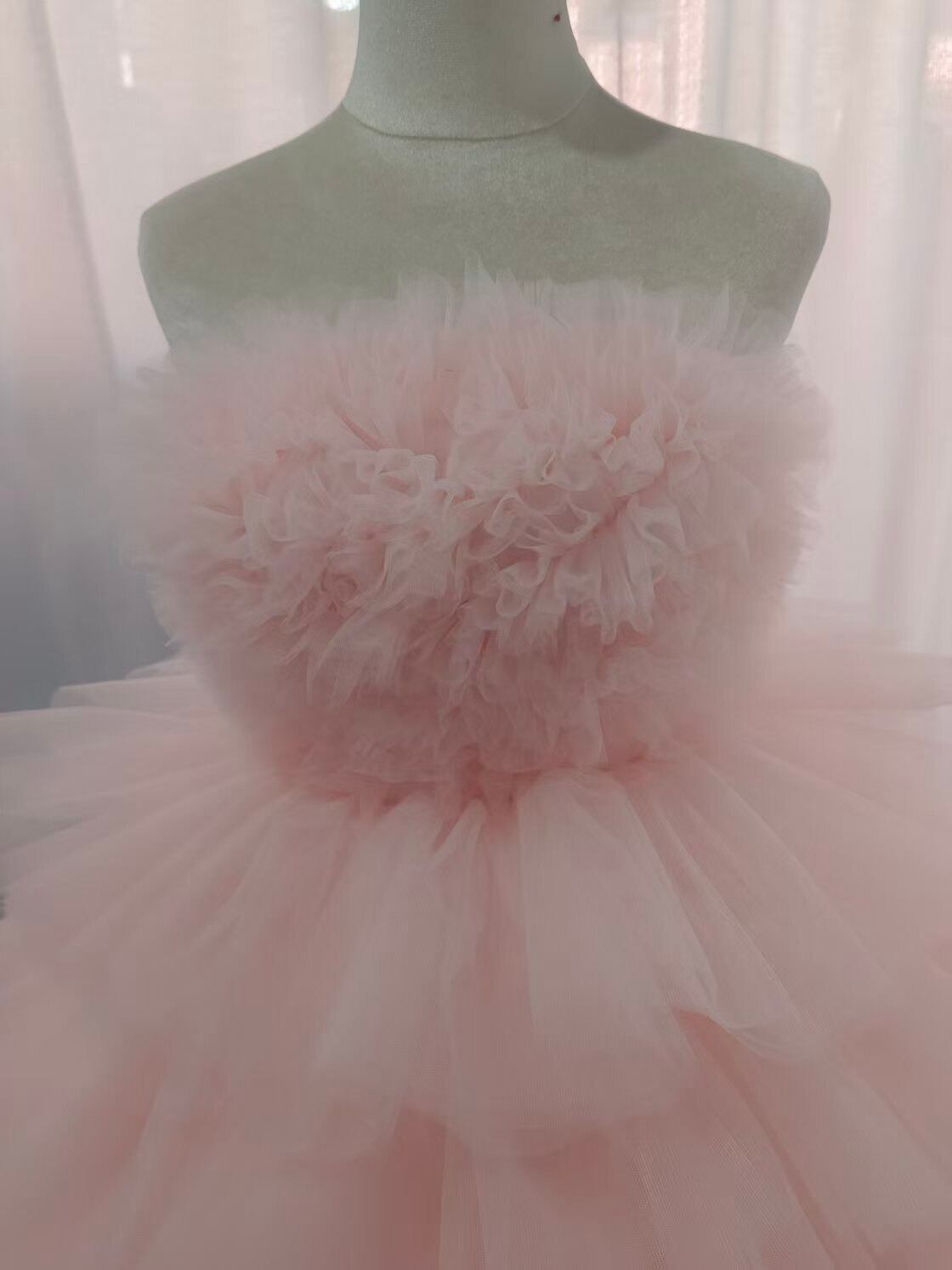 カラードレス ピンク フレアスカート 柔らかく重ねたチュールスカート ベアトップ 結婚式