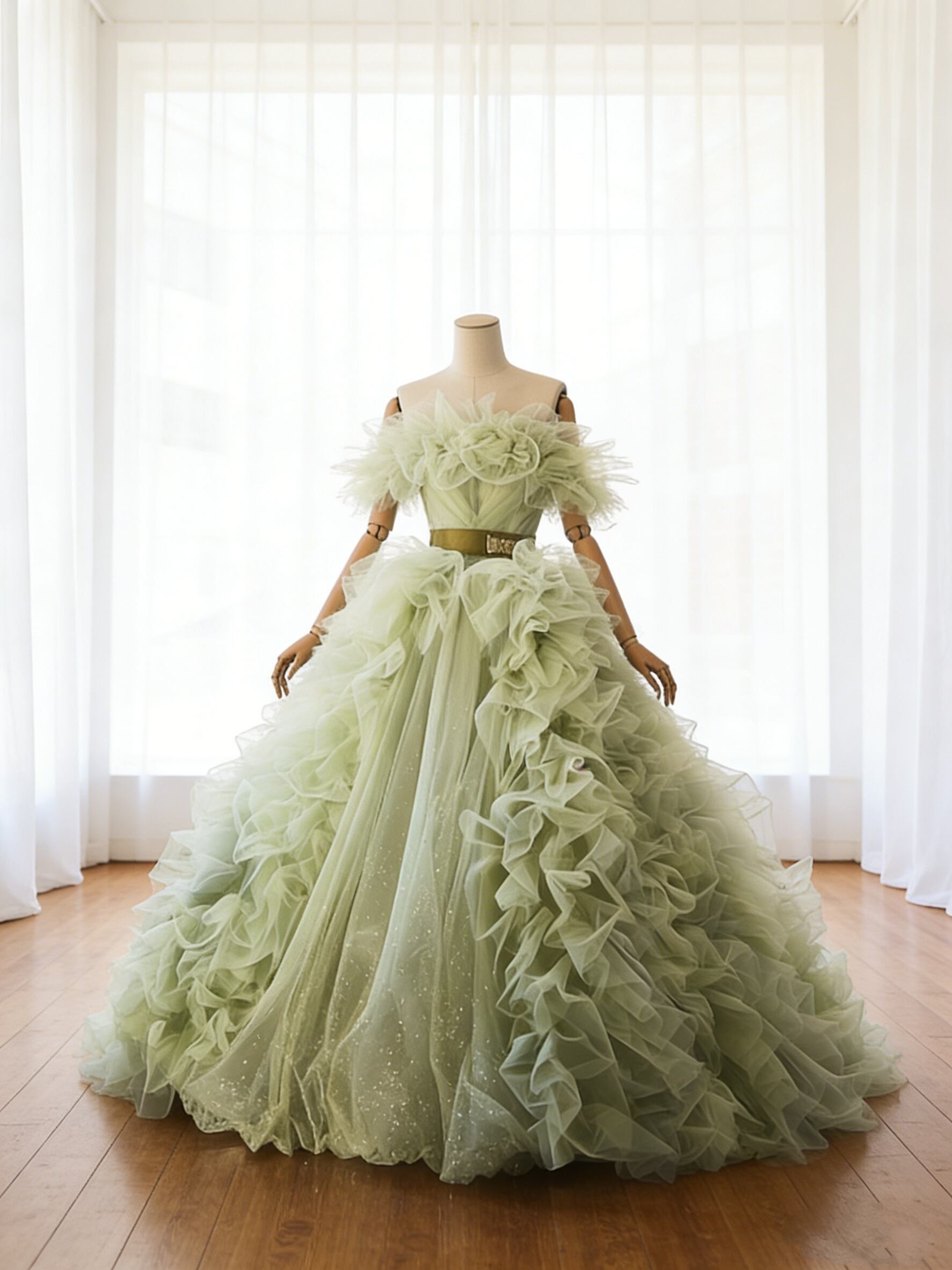 カラードレス グリーン オフショルダー キラキラチュール 華やかなトレーン プリンセスライン 抜群におしゃれ度が際立つ ブライダル