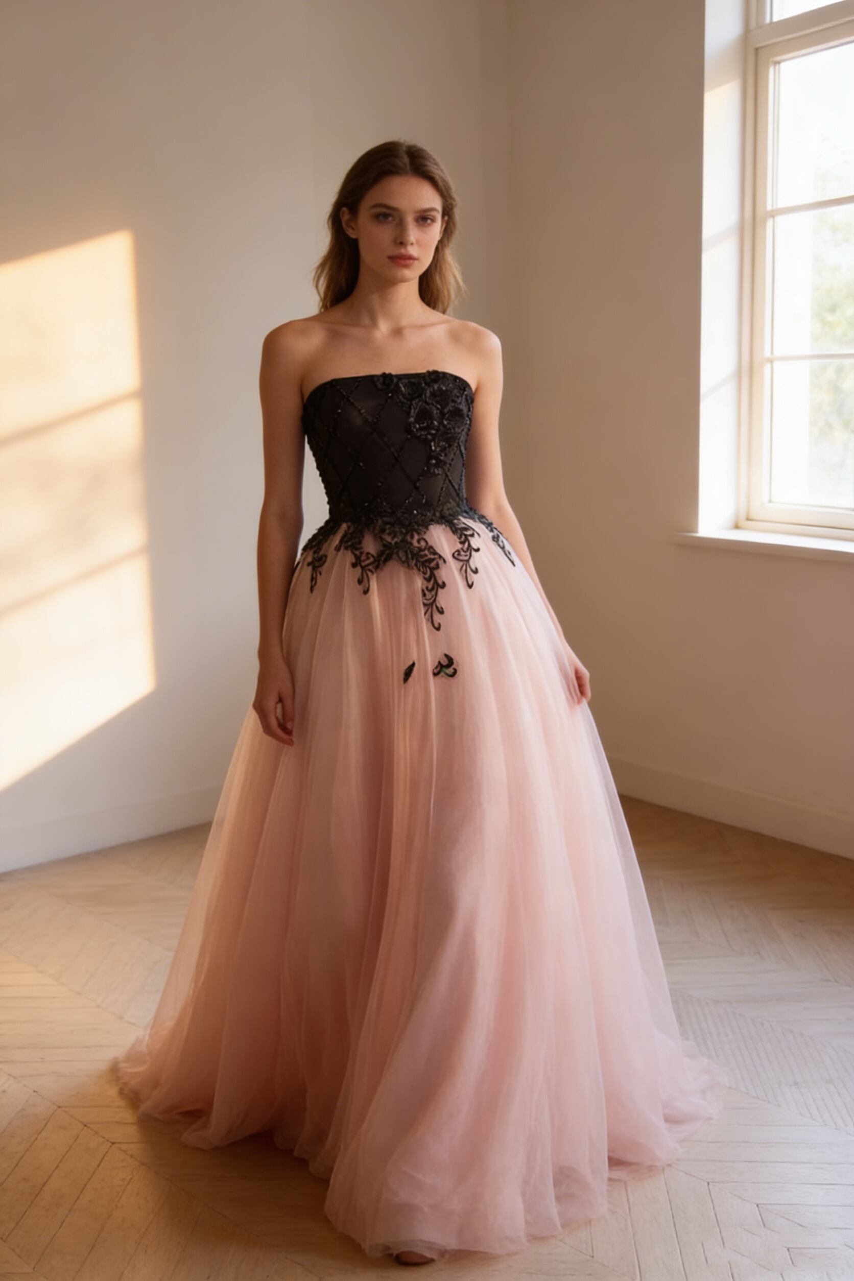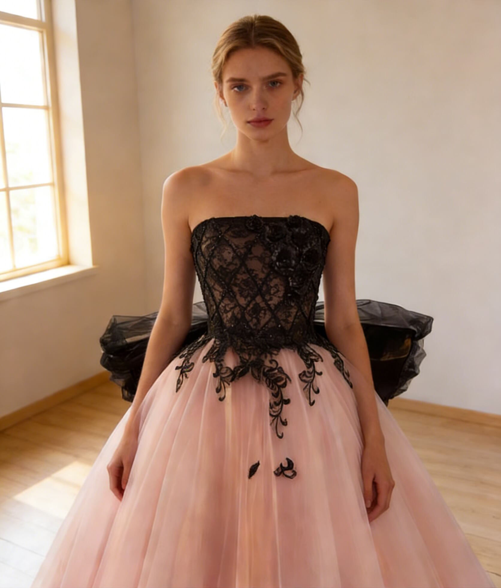 カラードレス ピンク ブラック ふっくら柔らかなバックリボン 魅惑の花レース チュールスカート 結婚式