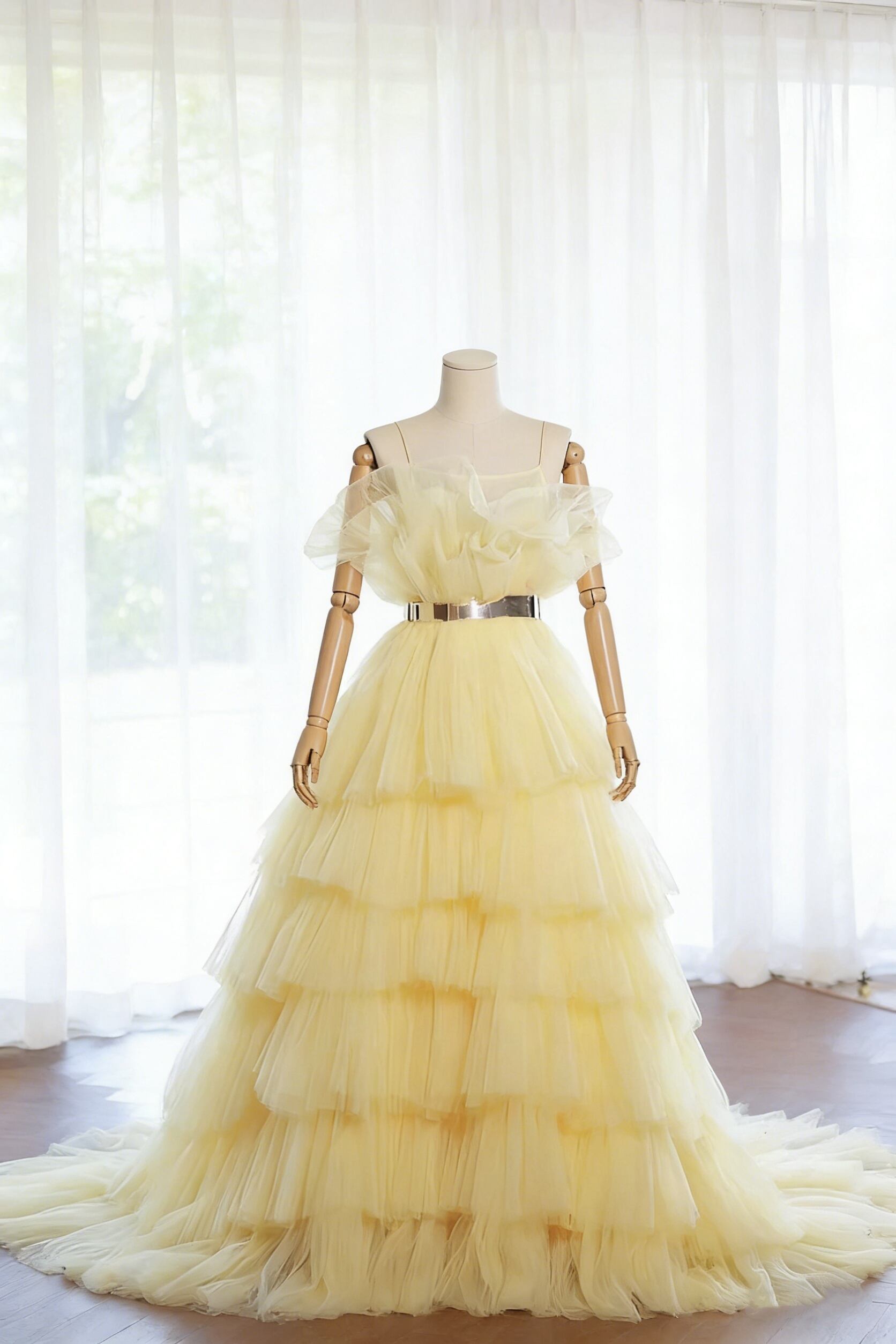 カラードレス イエロー ティアードのドレス キャミソール プリーツドレス プリンセスライン 前撮り