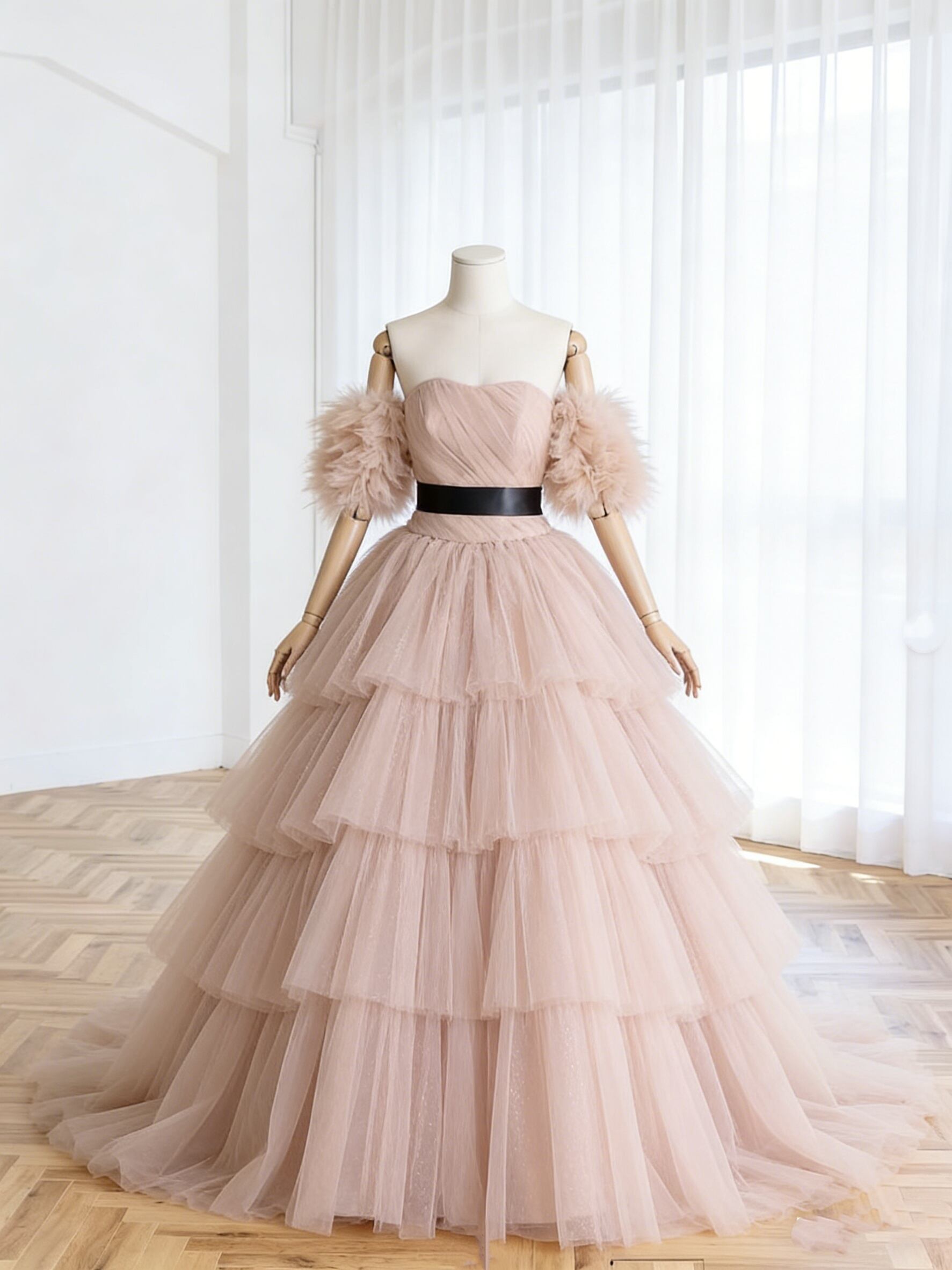 カラードレス 薄シャンパン色 ティアードのドレス フリル袖 サッシュベルト 花嫁 ふわふわドレス 結婚式